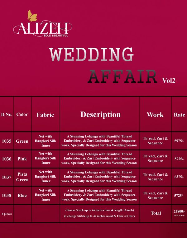 Alizeh Presents Weeding Affair Vol-2 1035 - 1038 Series Beautiful Net With Banglouri Silk Inner Weeding Bride Wear Lehenga Choli Collection