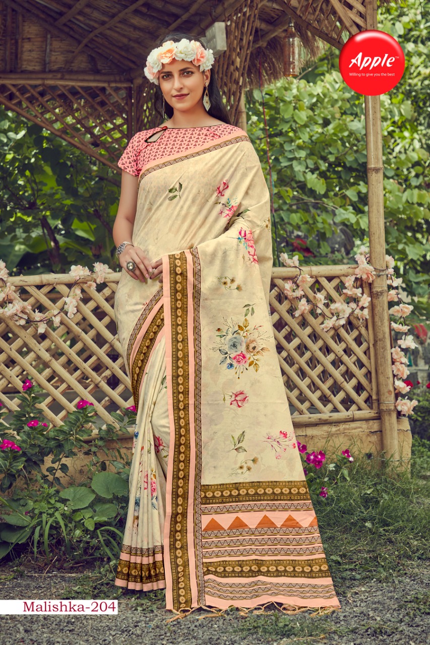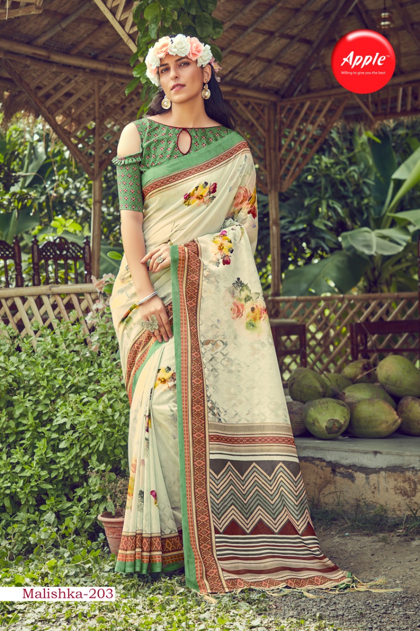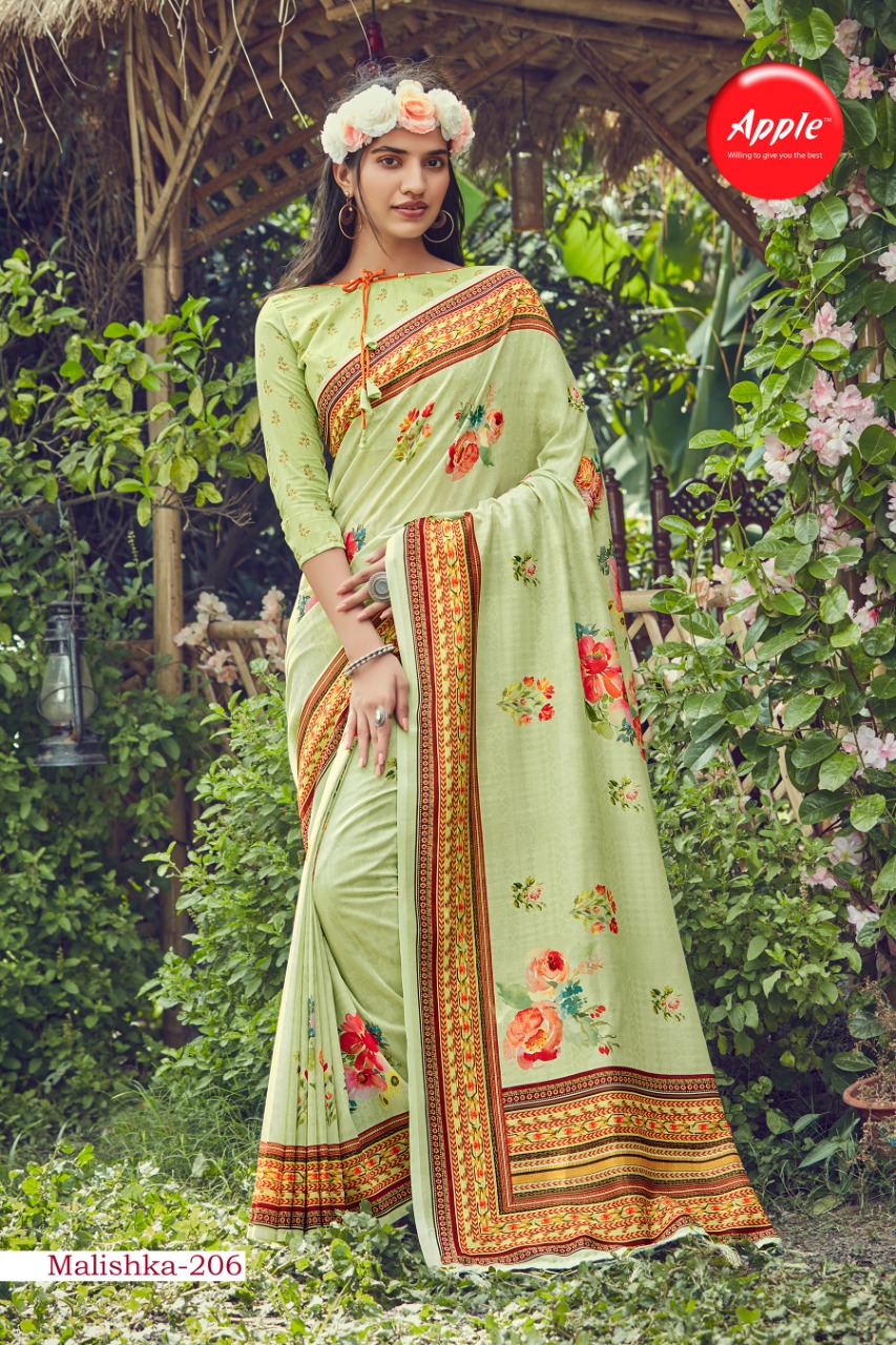 Apple Presents Malishka Vol-2 201 - 208 Series Muslin Silk With Fancy Designer Print Attractive Look Event Wear Saree Collection