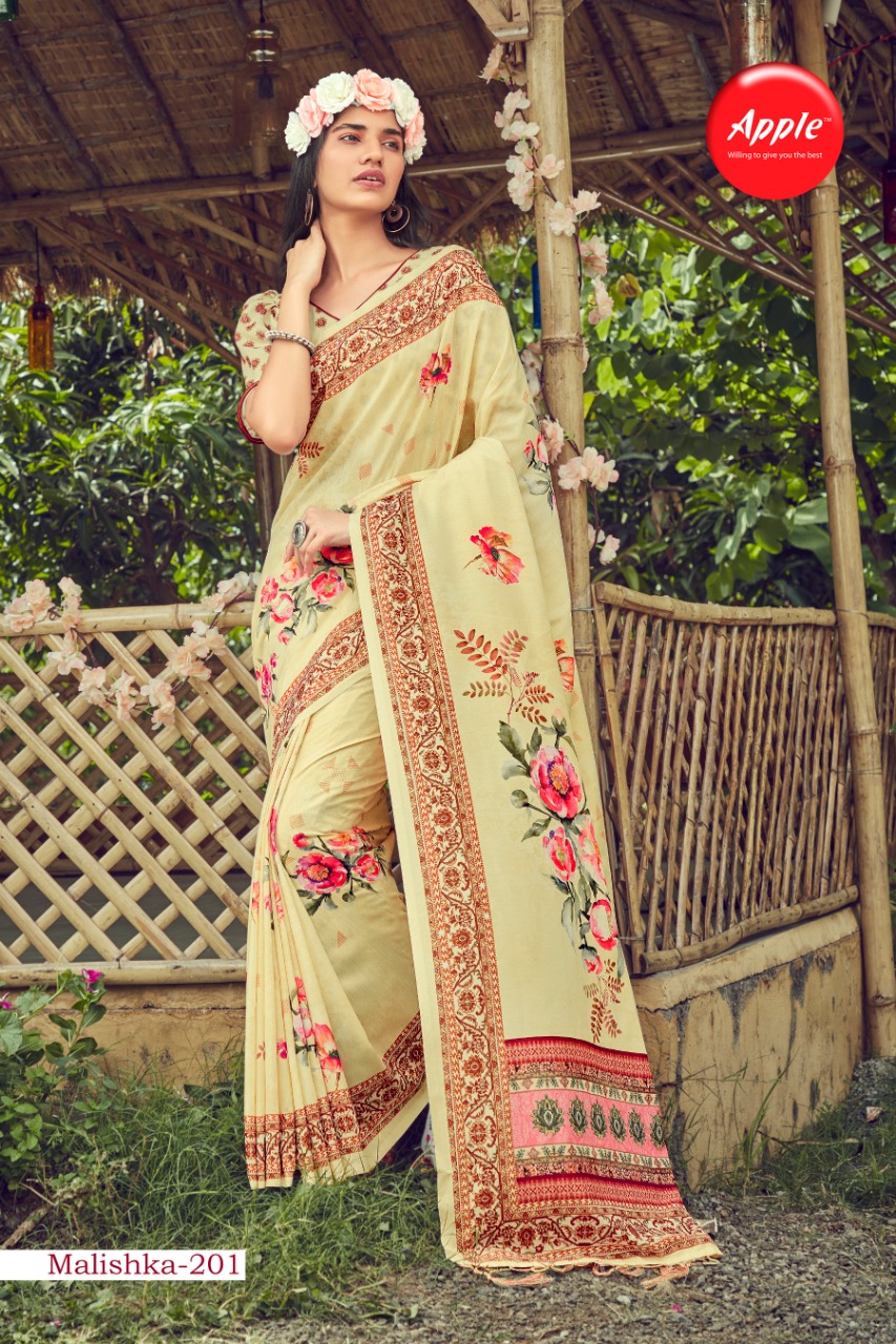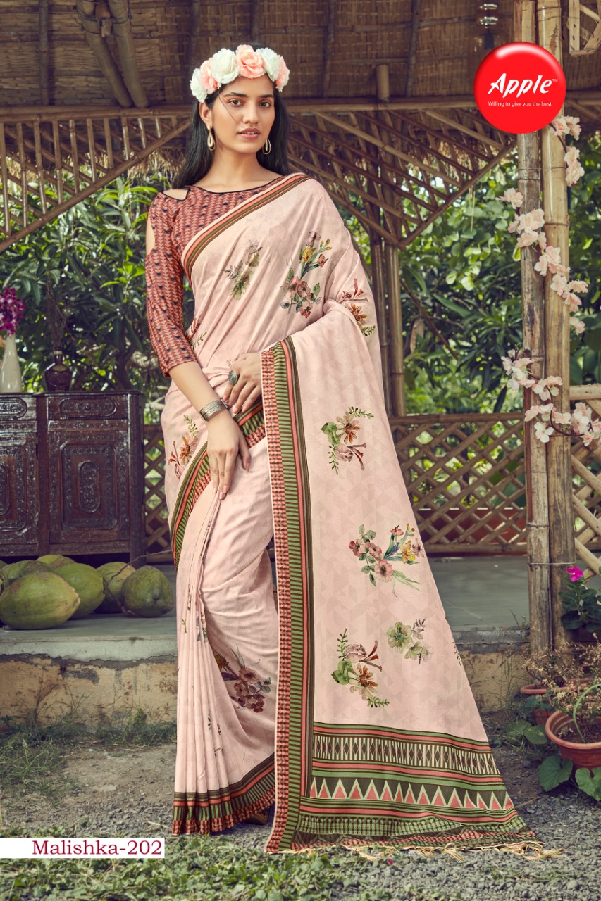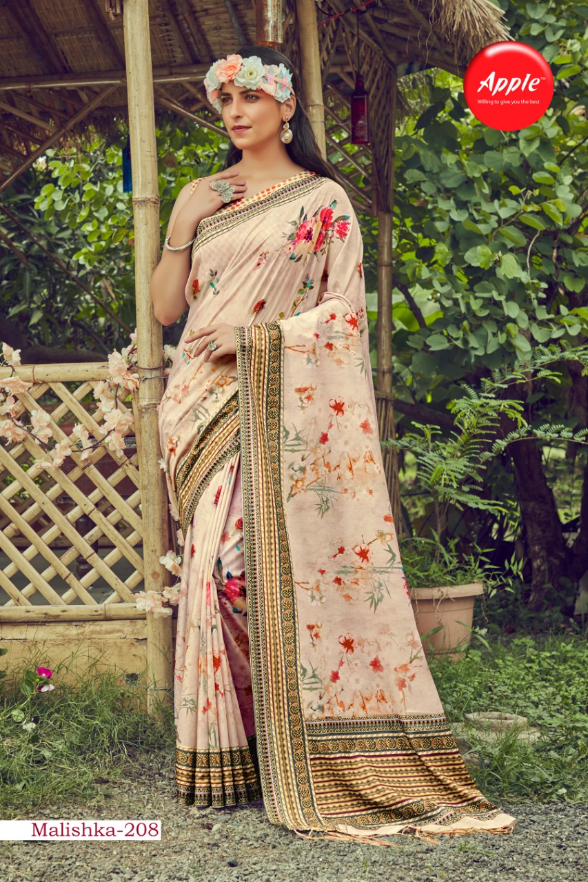 Apple Presents Malishka Vol-2 201 - 208 Series Muslin Silk With Fancy Designer Print Attractive Look Event Wear Saree Collection