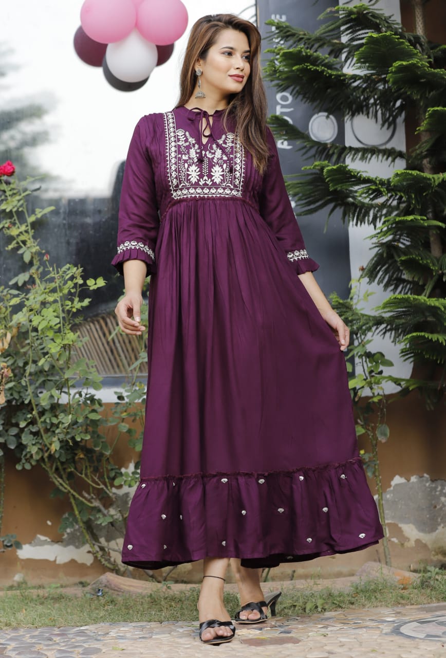 Balaji Emporium Heavy Rayon Flared Printed Long Gowns With Embroidery Work