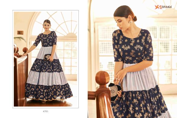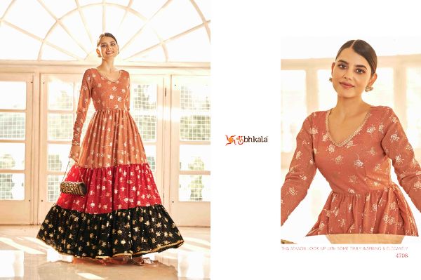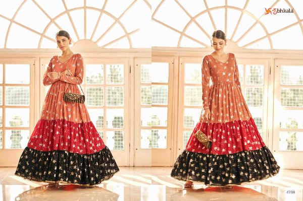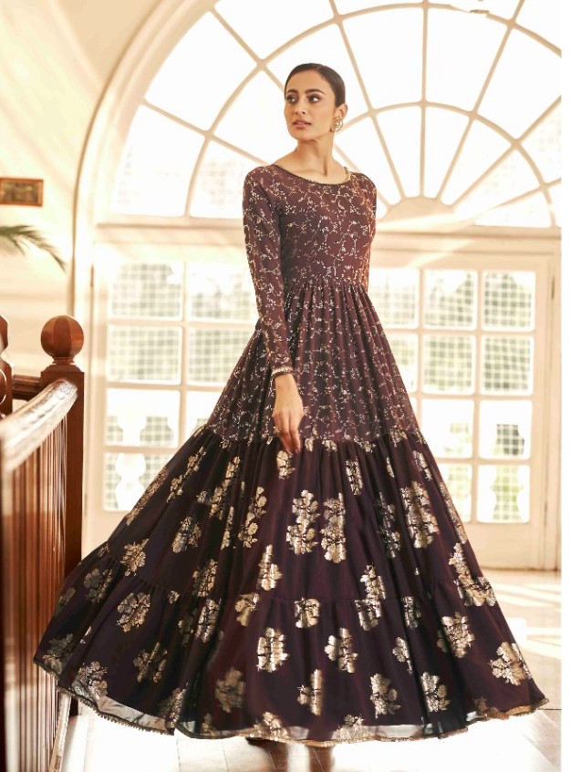 Latest Designer gown Collection. Exclusive with Foil & Thread Embroidery Work gives a Fashionable Look, High sensed style and luxury makes you ready for envious glazes and very rich & Royal in the Party, Function, Event etc.