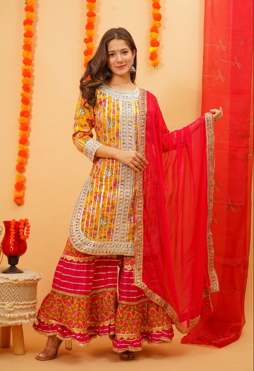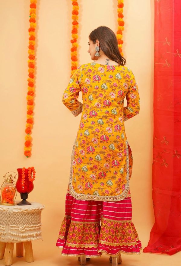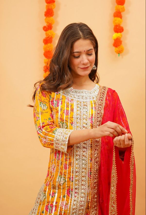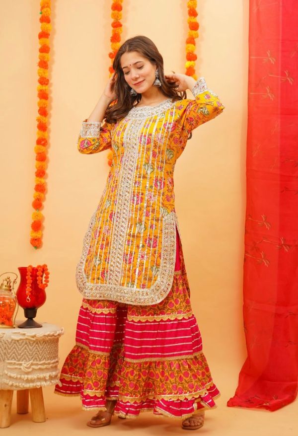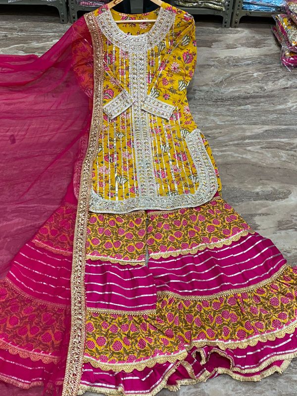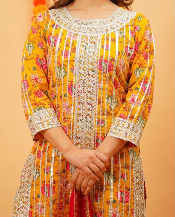 Balaji Emporium Presents Premium Cotton Printed Apple Cut Kurti With Gotta Work On Yoke And Sleeves Collection