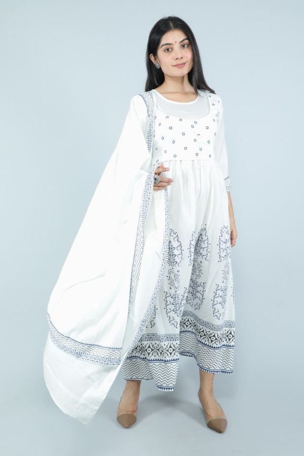 Balaji Emporium Rayon Block Print Flared Gown With Malmal Block Print Four Side Broder Dupatta Collection