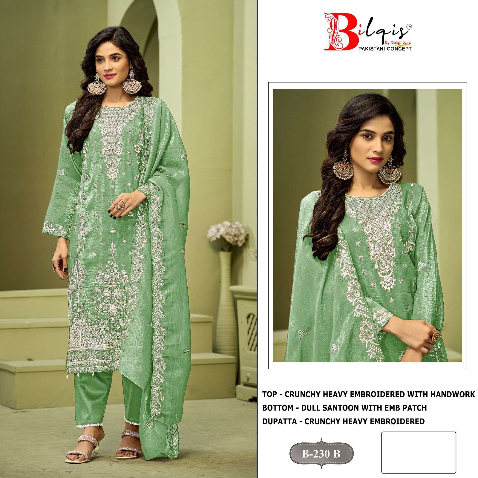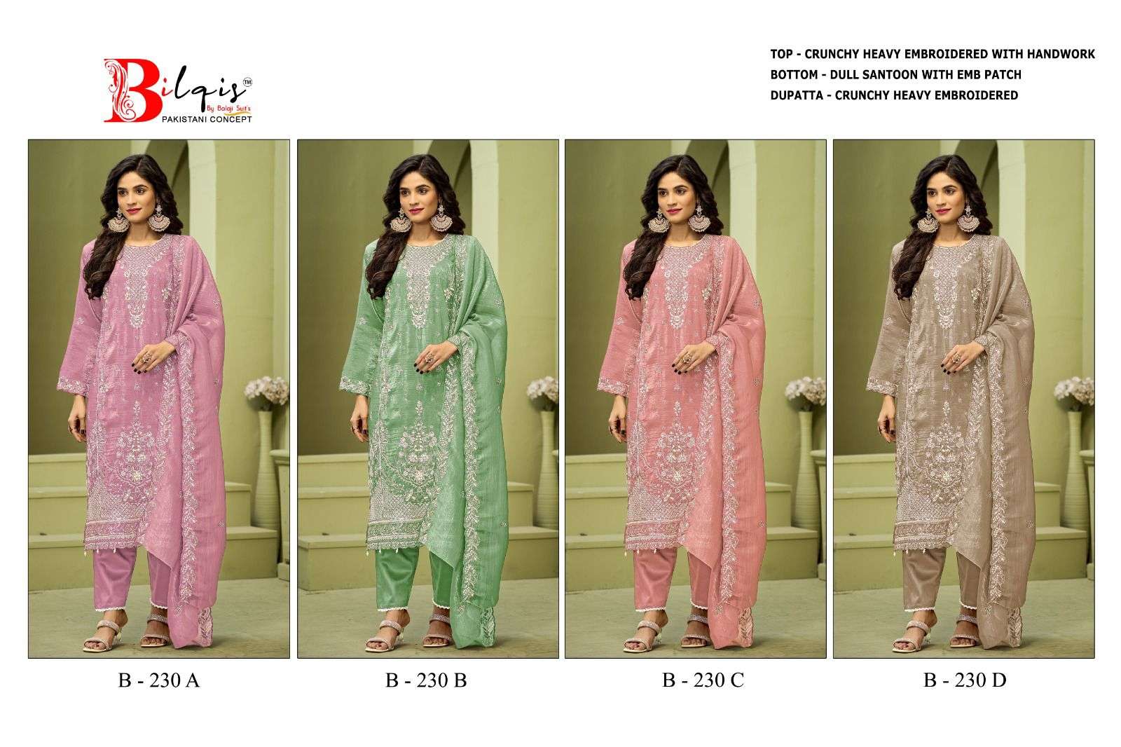 | Catalogue: | BILQIS B 230 A TO D CRUNCHY EMBROIDERED & HAND WORK PAKISTANI SUIT |