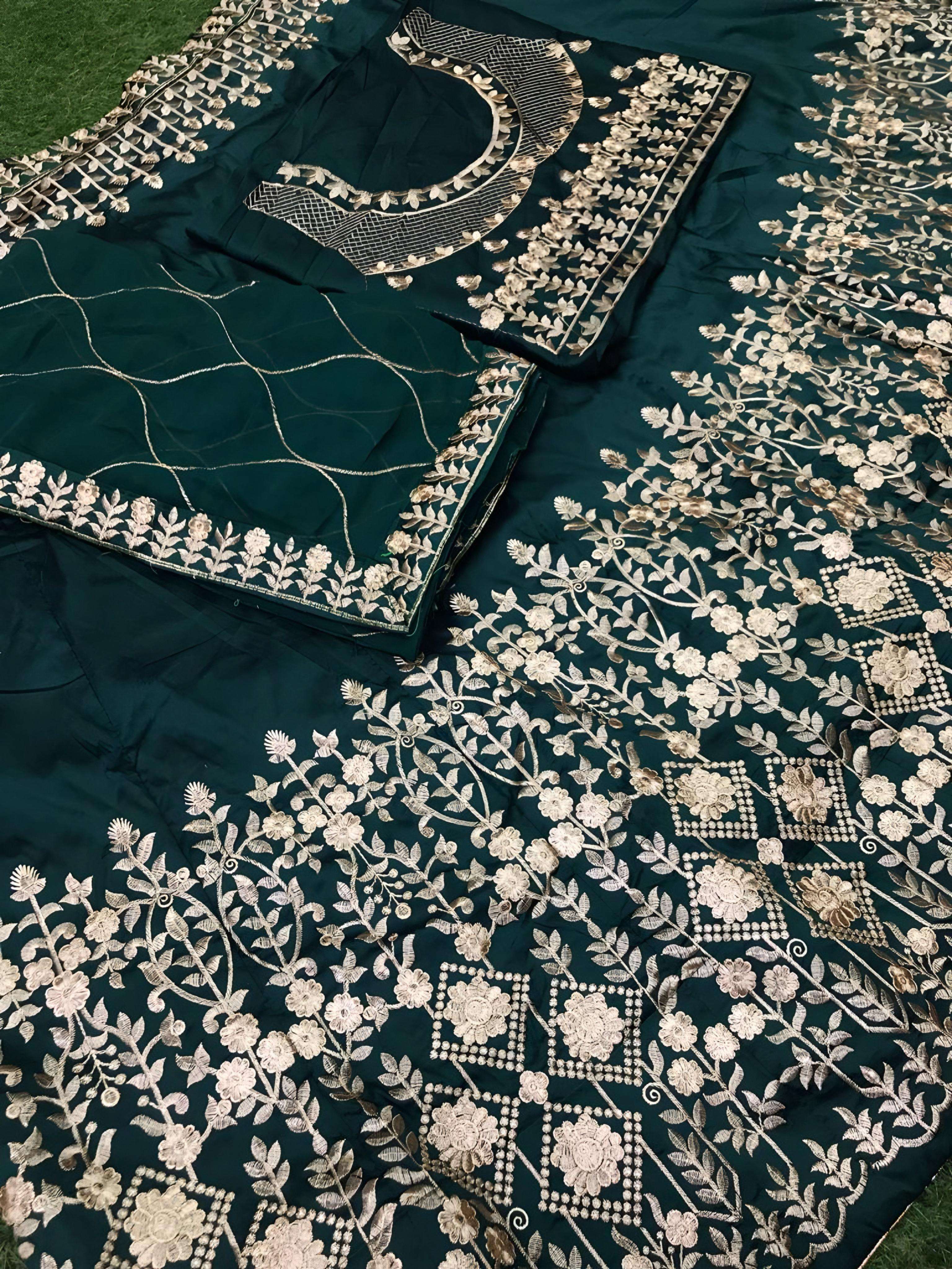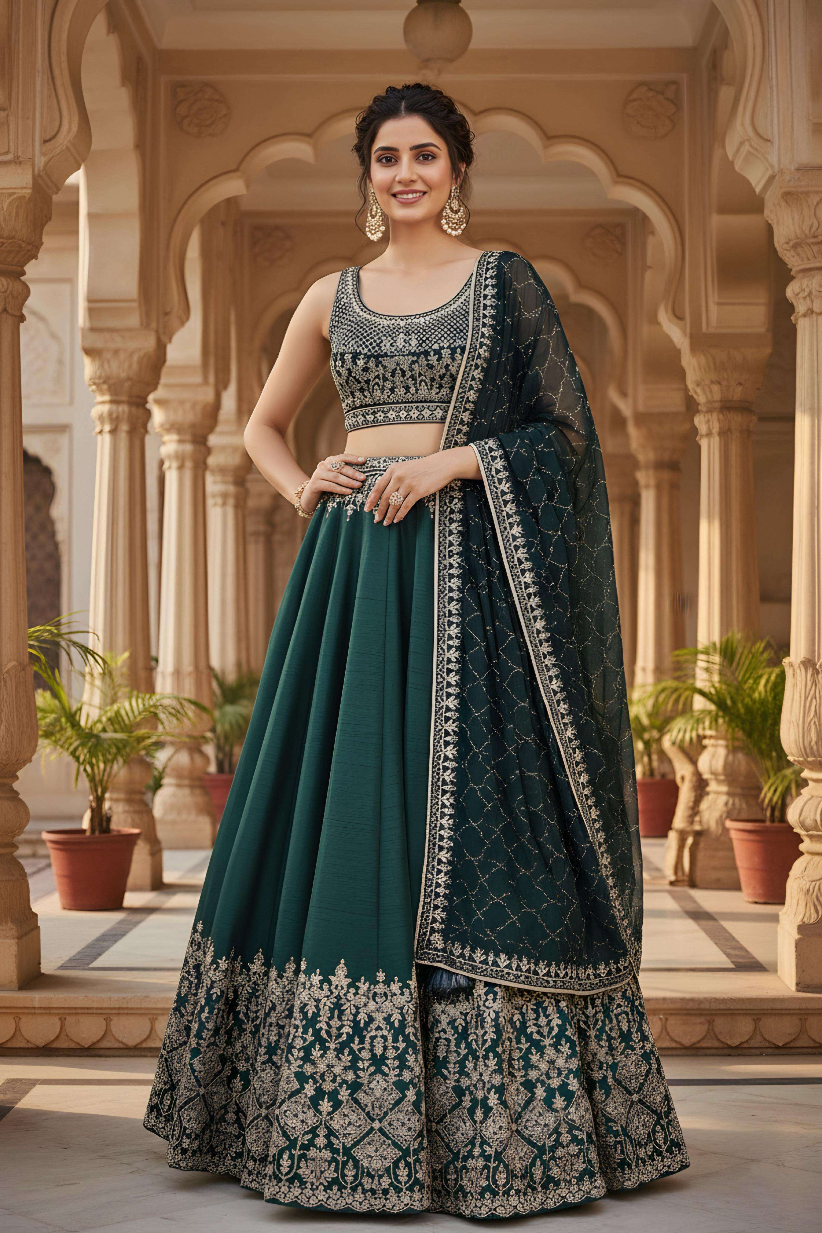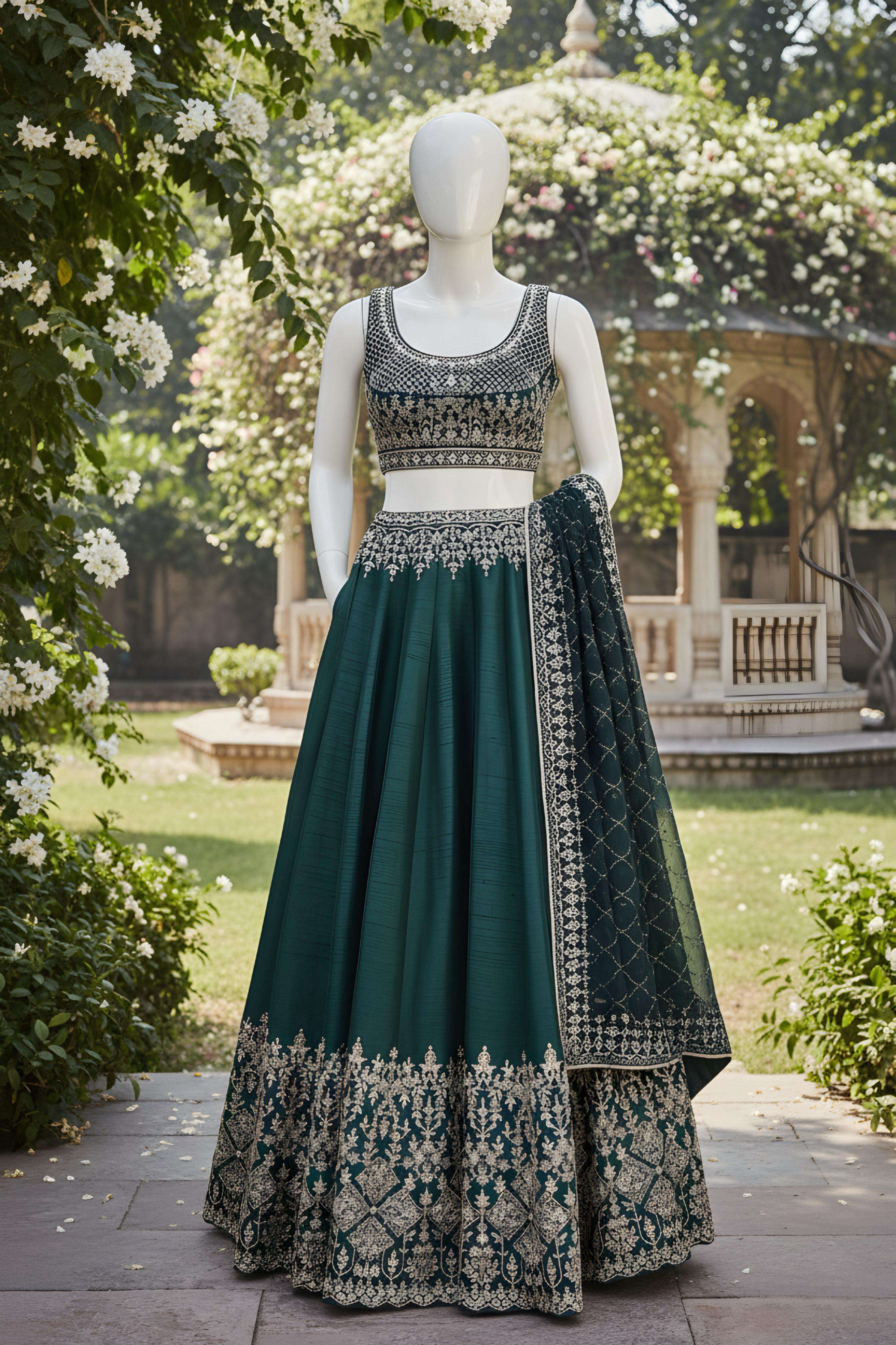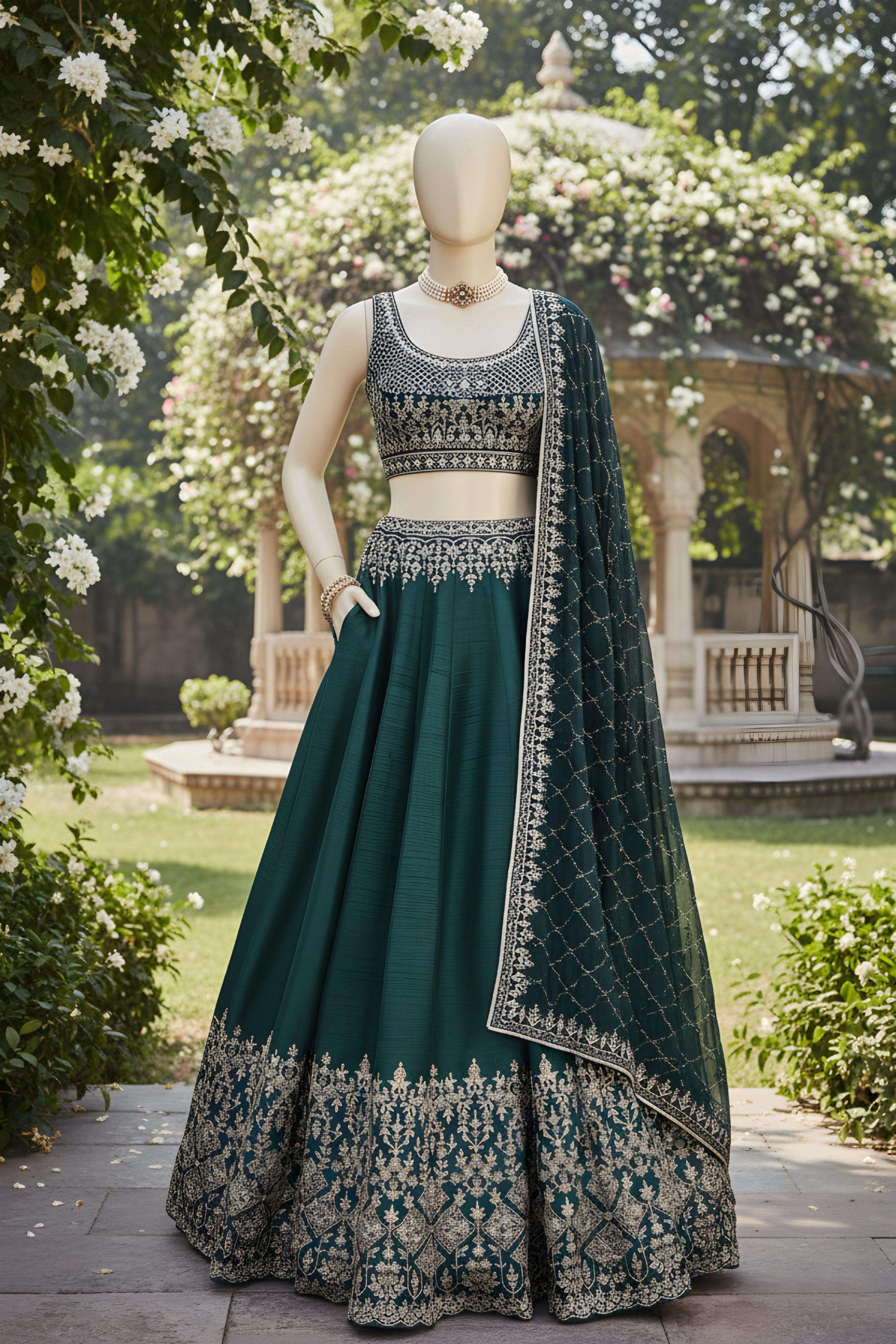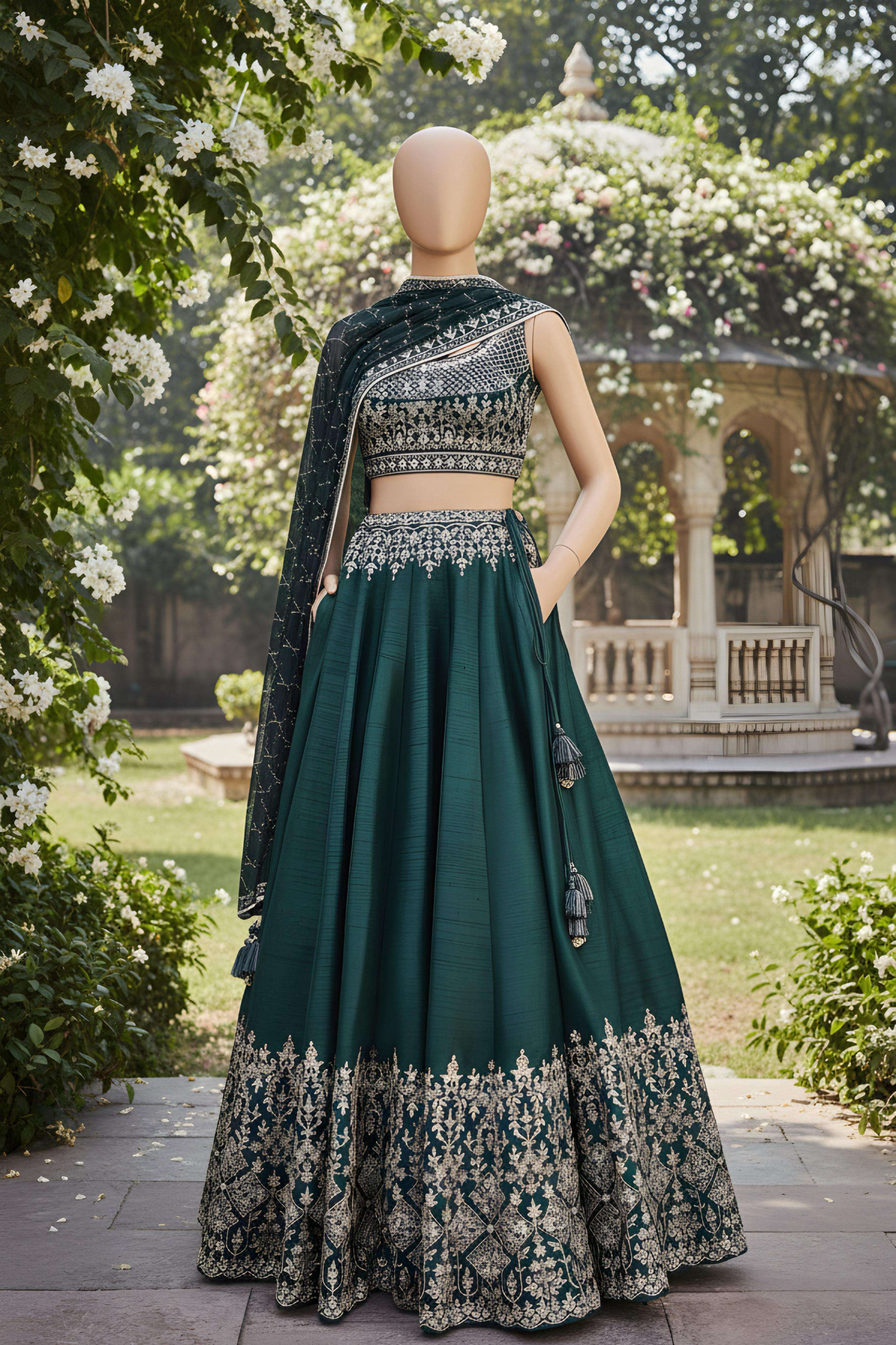 The rich forest green skirt, the intricate gold embroidery, and the stunning embellished blouse—every detail of this lehenga is a masterpiece. Ready for the celebration!