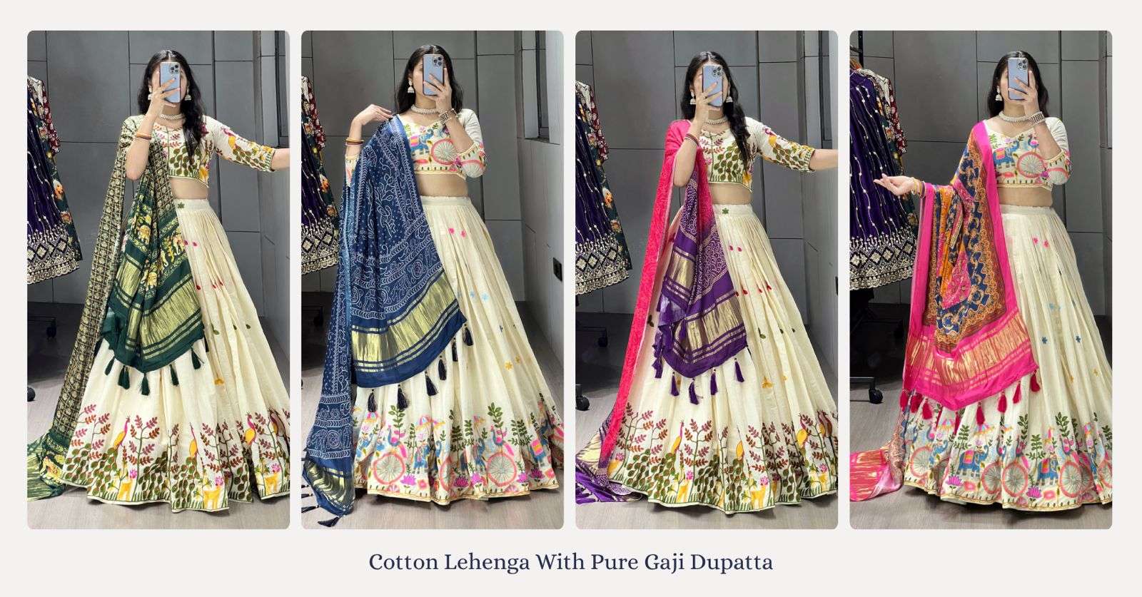 Package Contain: Lehenga (Fully Stitched), Blouse( Fully Stitched) , Gaji Dupatta, Drawstring with Zip, Tassels