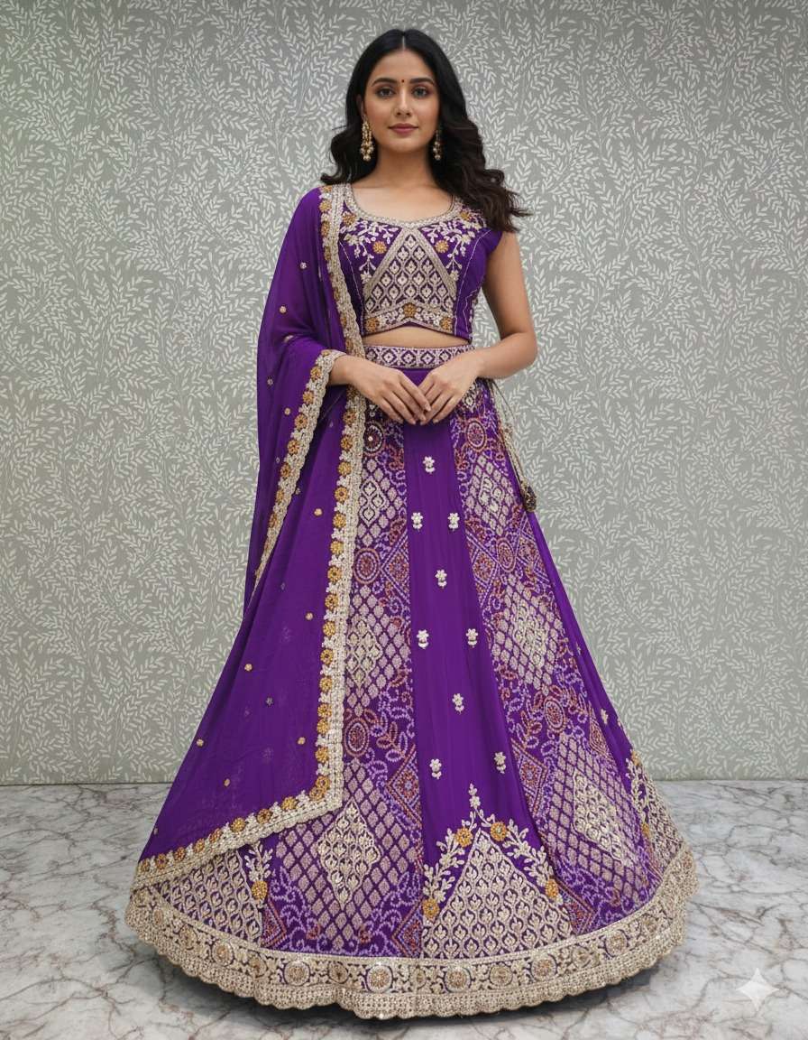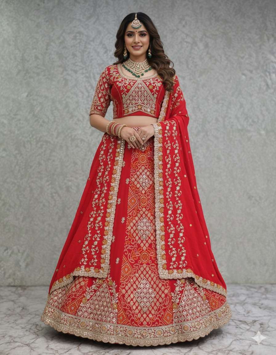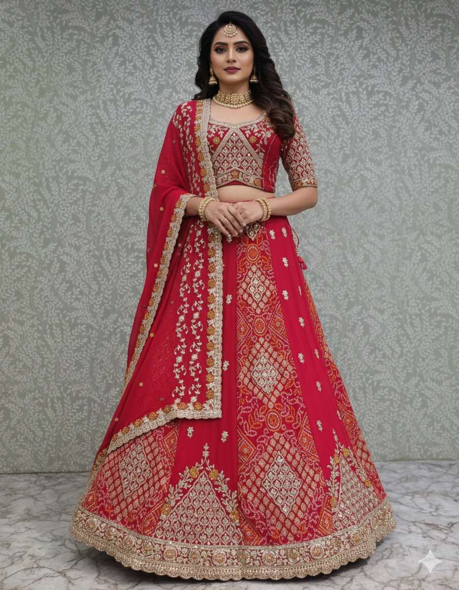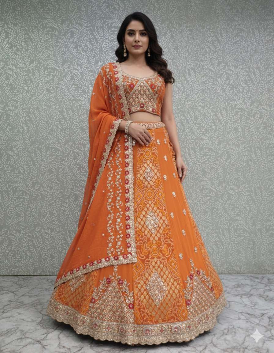 Lehenga Fabric : Viscose Georgette With Traditional Bandhani-inspired with floral jaal Cut Work Border ,Zari Work,Stone,Sequence With Embroidery and Gold (zari) Thread work Designer Work All Over Lehenga