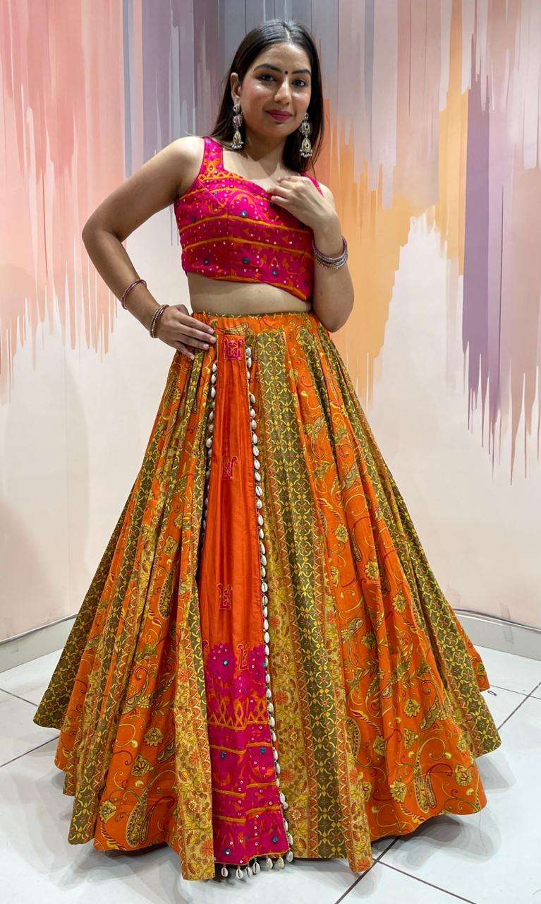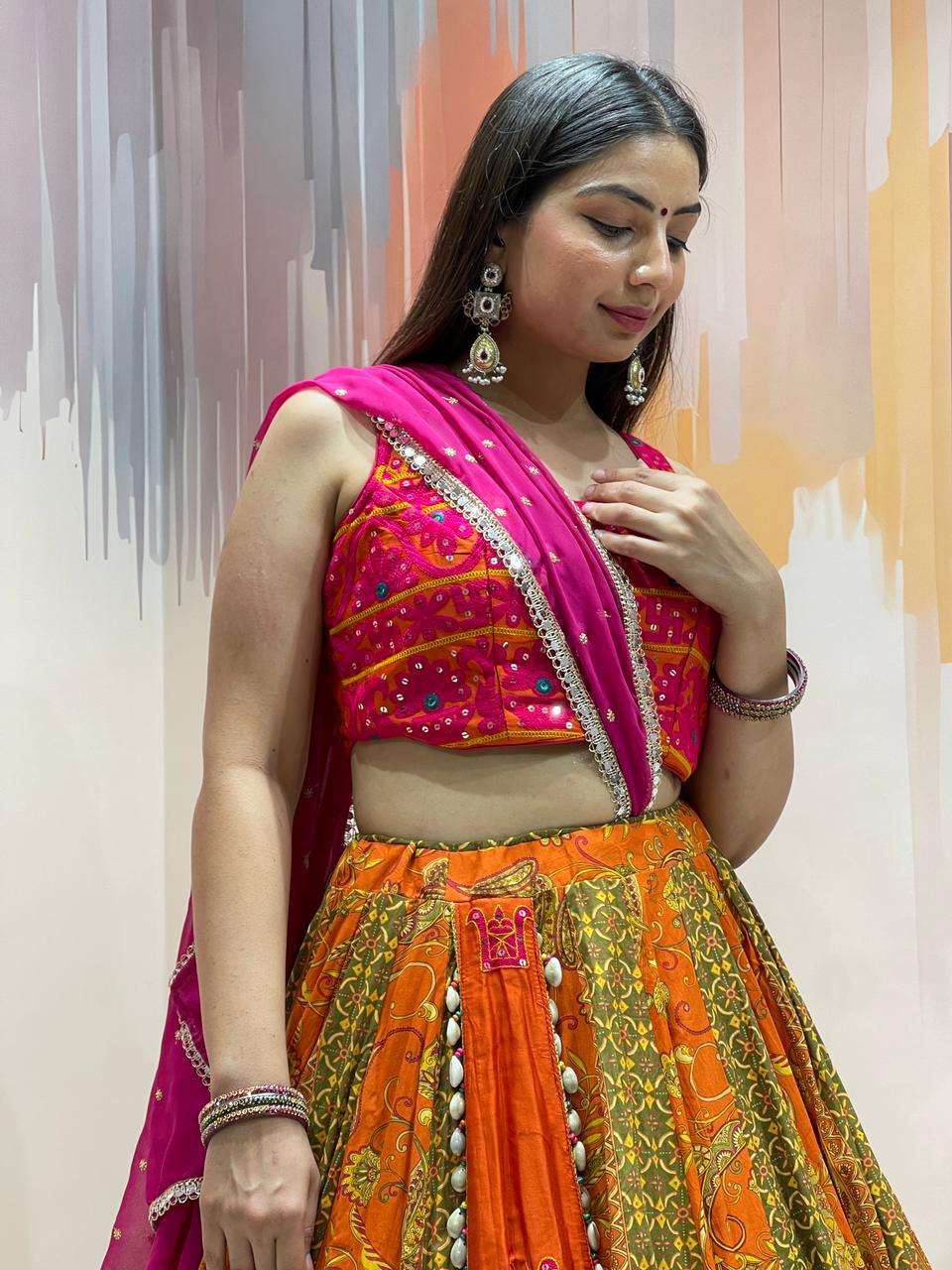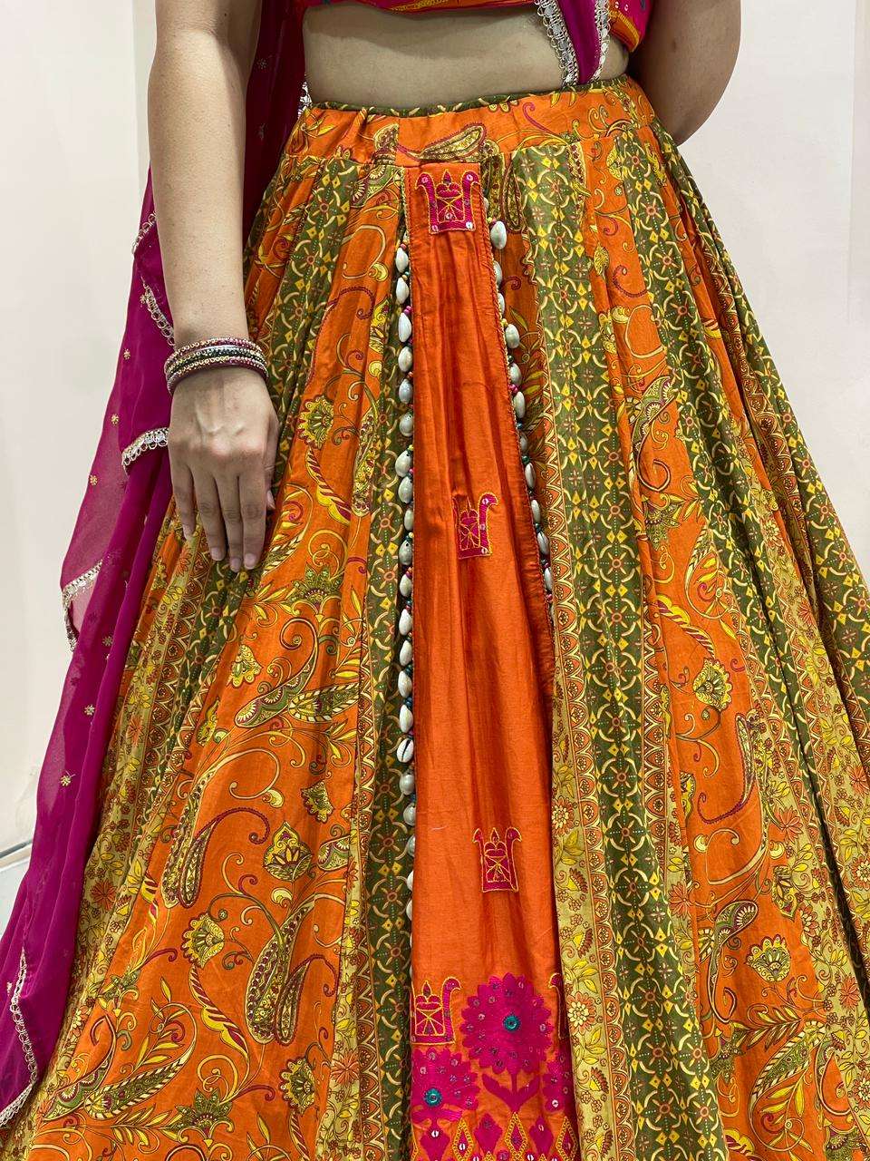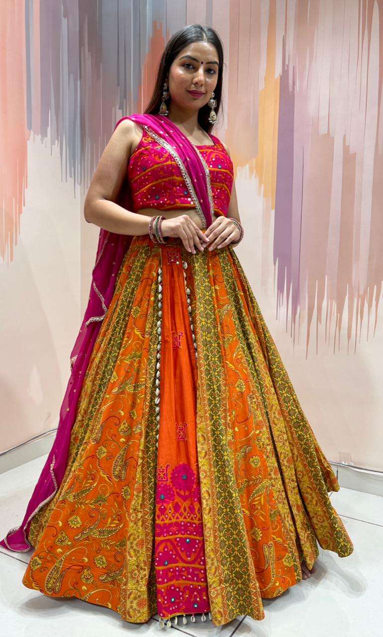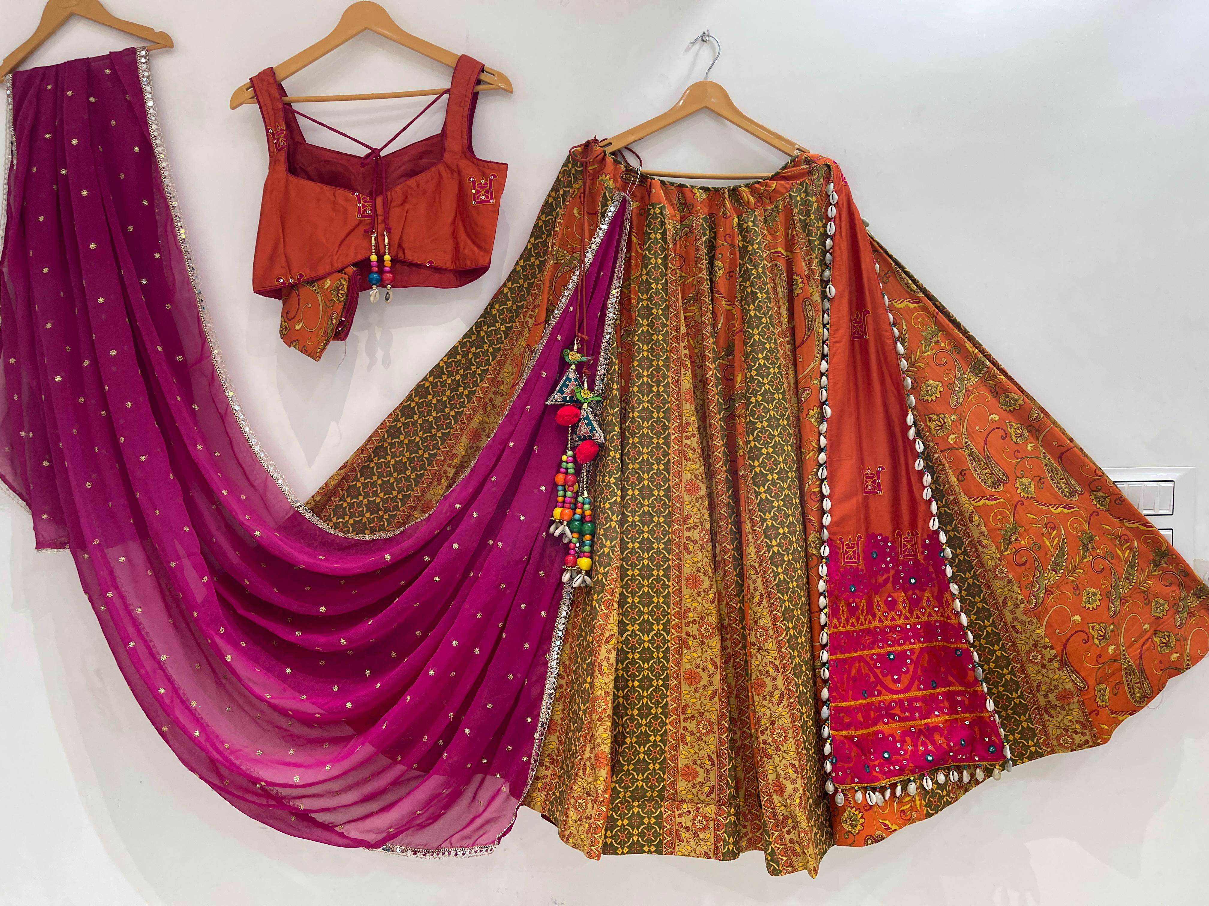 Absolutely Stunning Classic Vintage Printed with *Kodi work flap panel Amazing concept Kesariya Style Chaniya Choli*