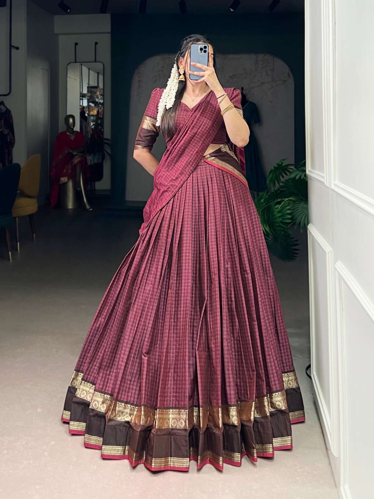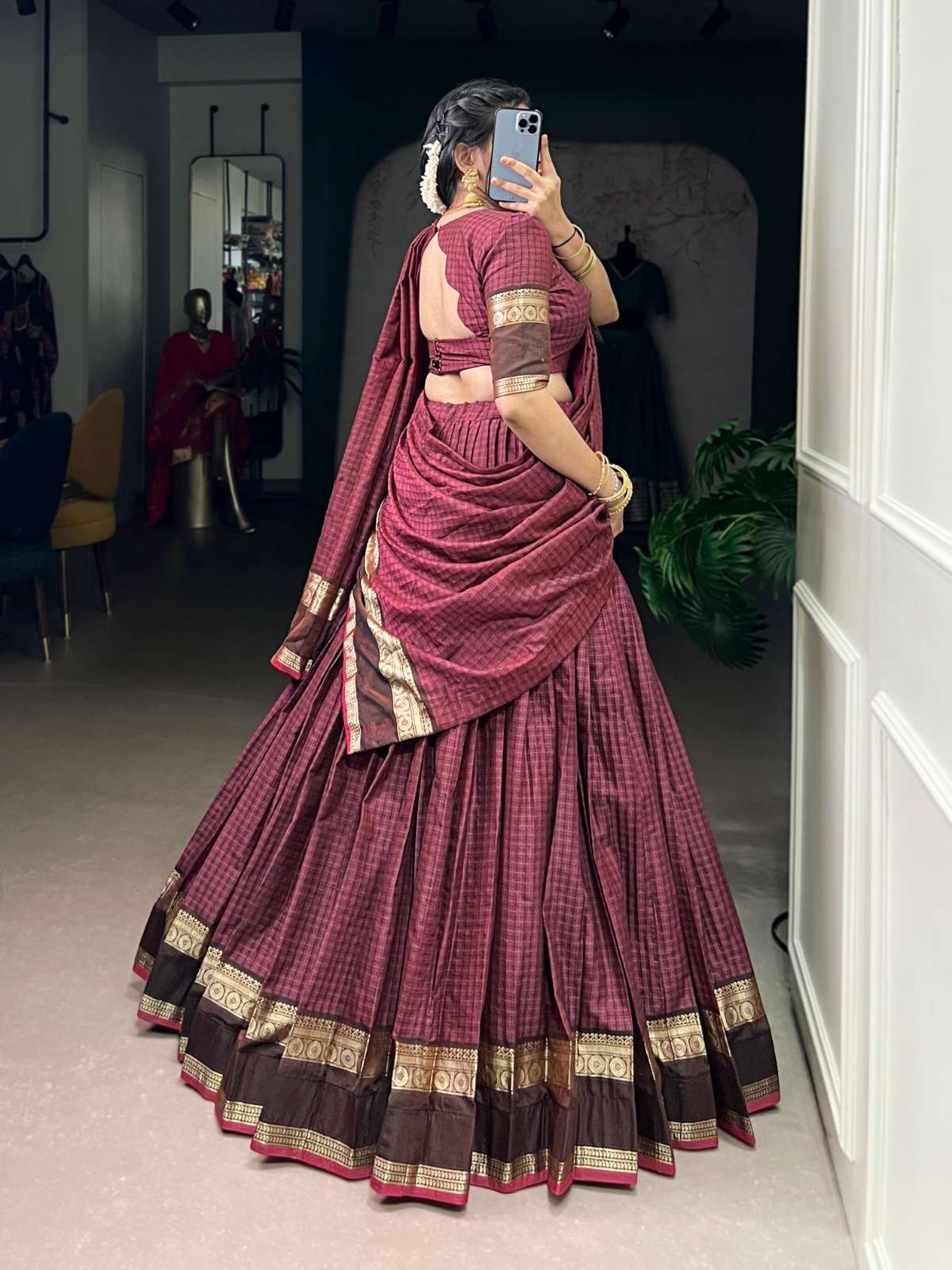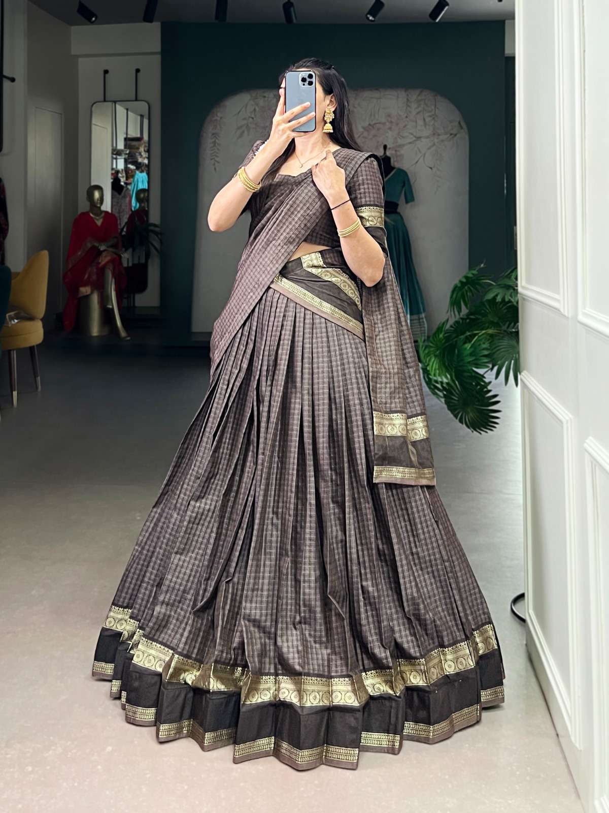 From its earthy tones to its intricately woven borders, every detail in this Chettinad cotton lehenga whispers tales of craftsmanship and timeless elegance