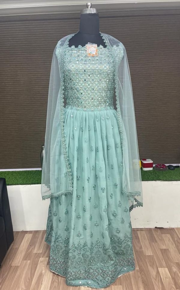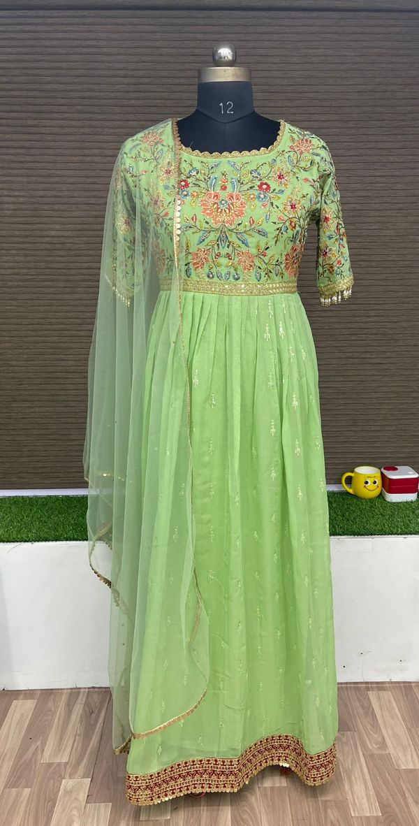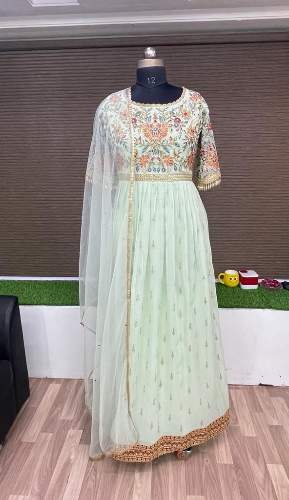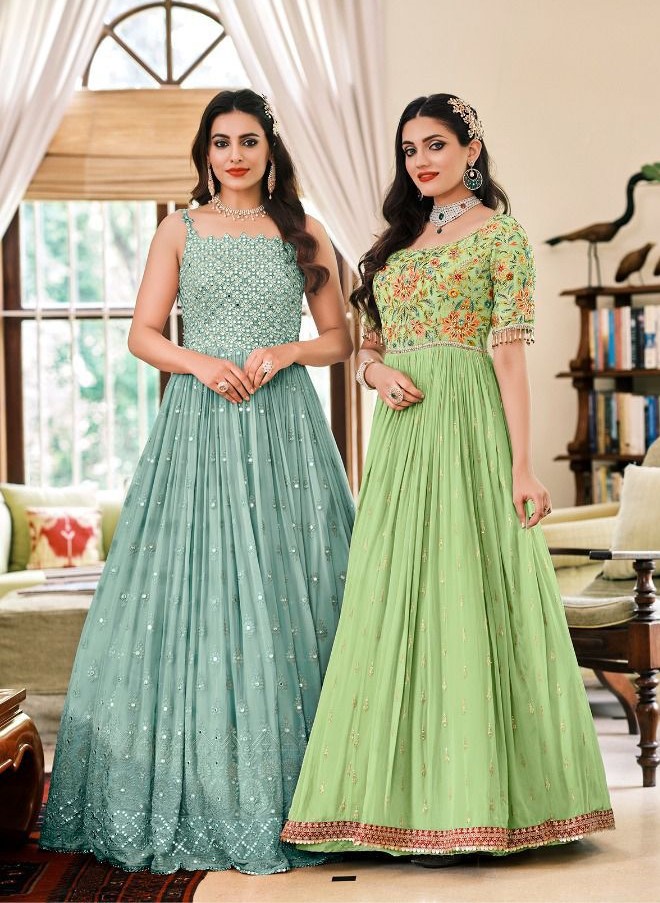Latest Designer gown Collection. Exclusive with Foil & Thread Embroidery Work gives a Fashionable Look, High sensed style and luxury makes you ready for envious glazes and very rich & Royal in the Party, Function, Event etc.