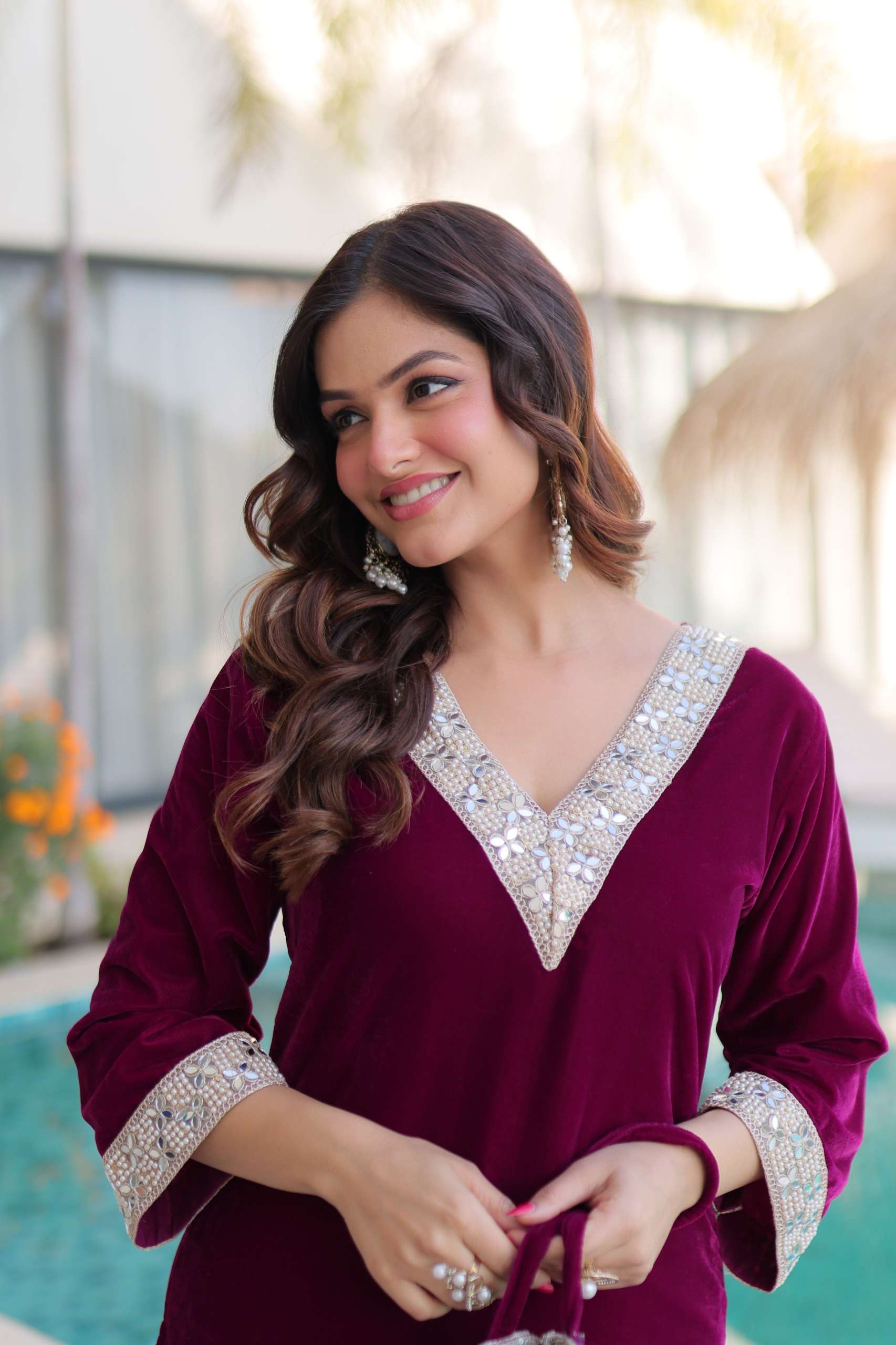 Get ready to shine with these stunning outfit Made from 9000 Velvet With Zari Embroidered & Real Mirror Work. Discover the perfect ensemble to add a touch of glamour to your wardrobe and stand out from the crowd.