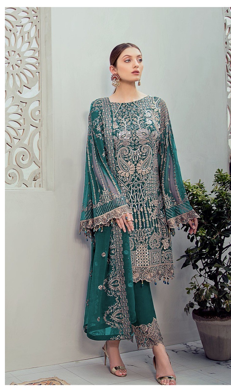 Latest Designer pakistani suits Collection. Exclusive with Foil & Thread Embroidery Work gives a Fashionable Look, High sensed style and luxury makes you ready for envious glazes and very rich & Royal in the Party, Function, Event etc.