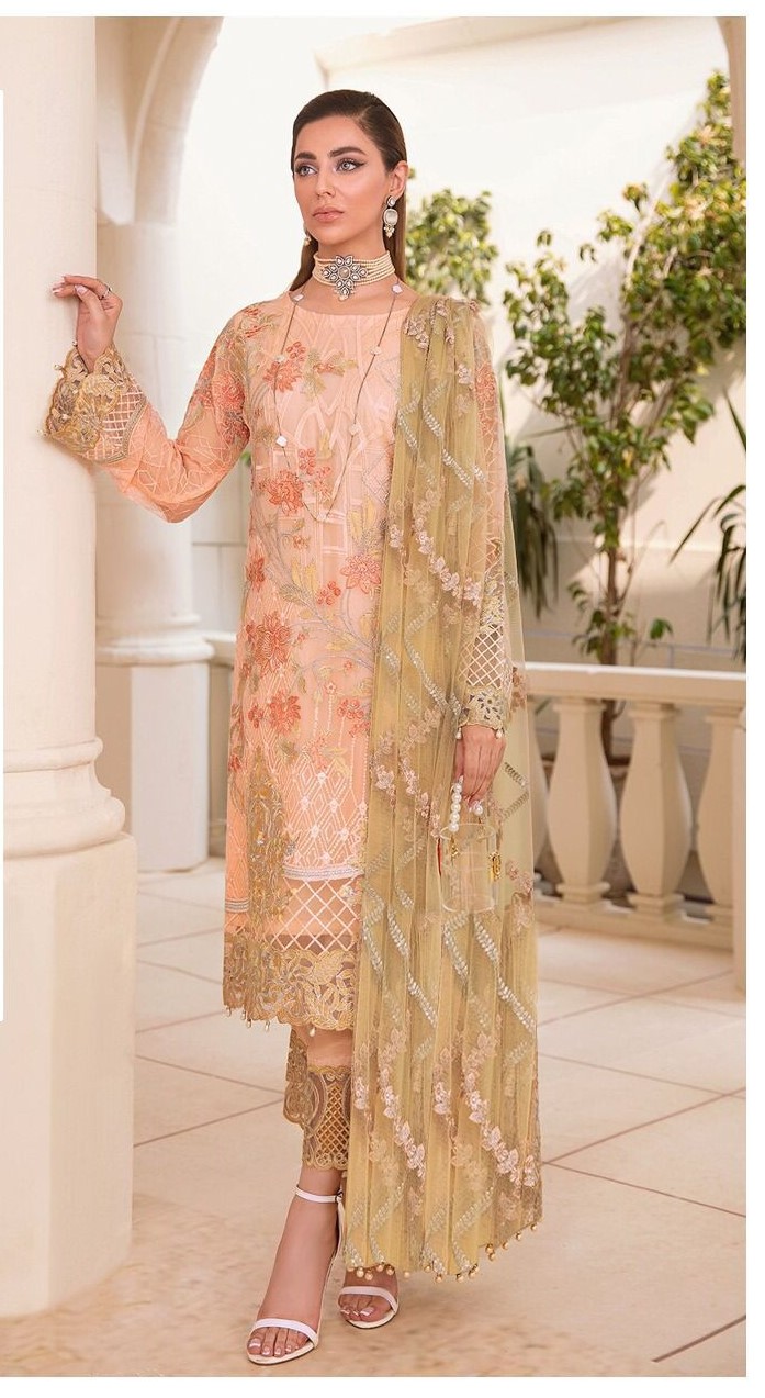 Latest Designer pakistani suits Collection. Exclusive with Foil & Thread Embroidery Work gives a Fashionable Look, High sensed style and luxury makes you ready for envious glazes and very rich & Royal in the Party, Function, Event etc.