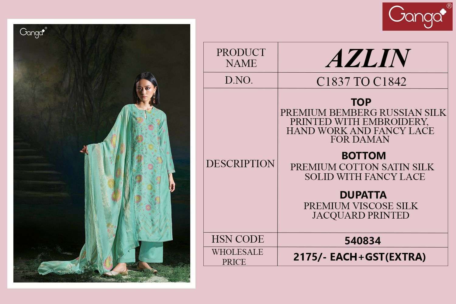 | Catalogue: | GANGA AZLIN C1837 TO C1842 PREMIUM BEMBERG RUSSIAN SILK PRINTED SUIT WITH EMBROIDERY, HAND WORK |