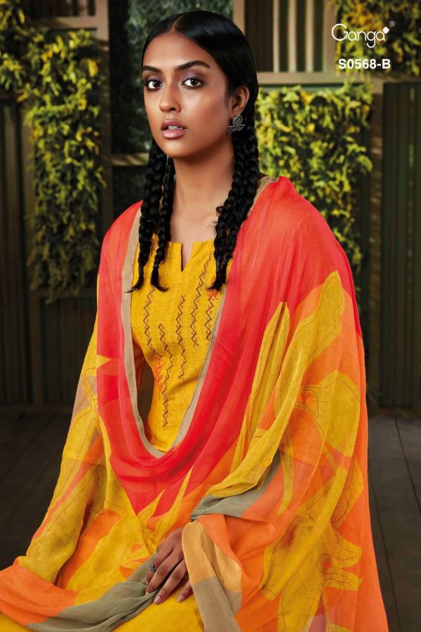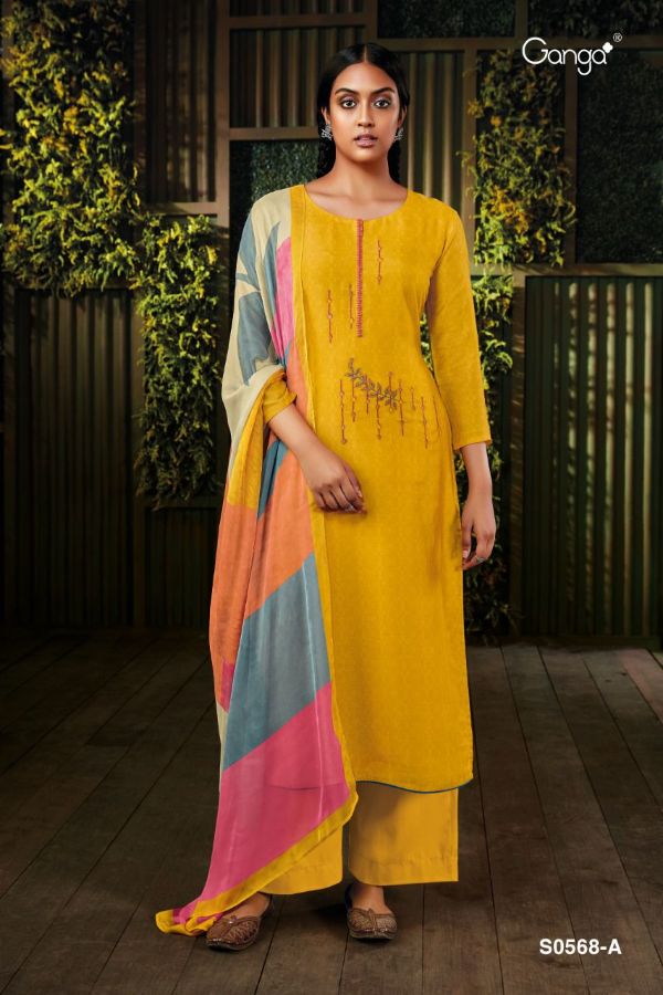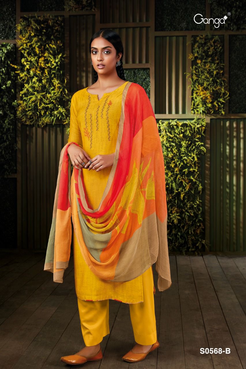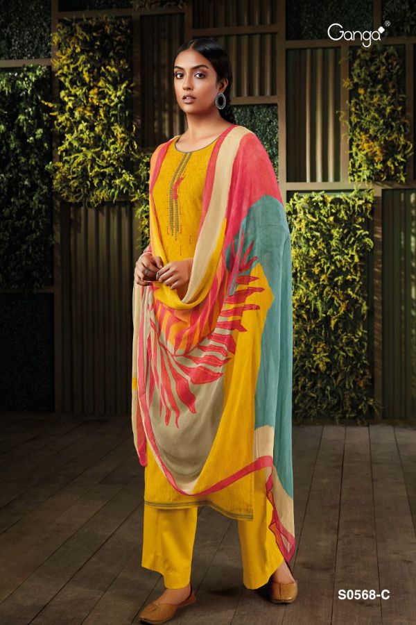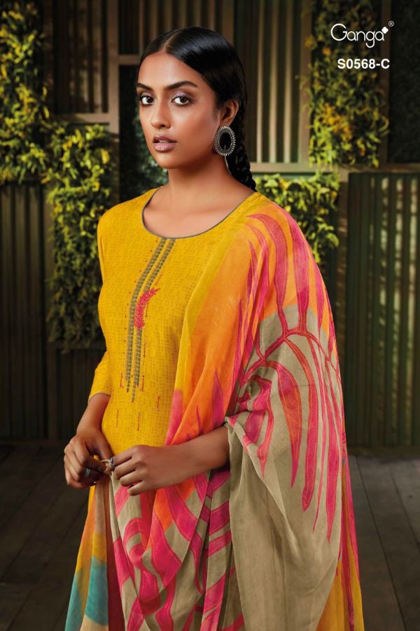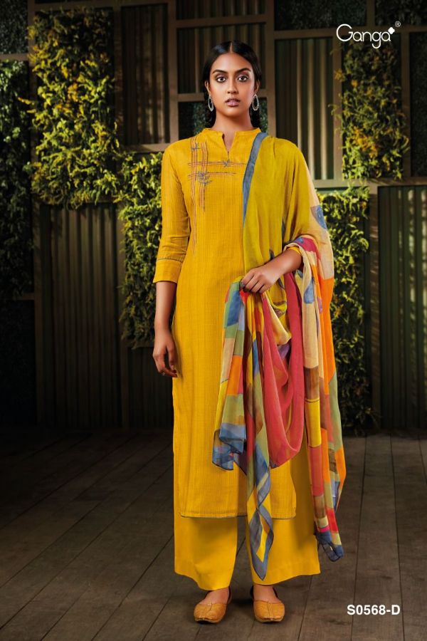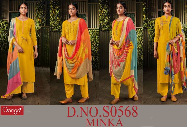 Ganga Presents Minka 568 S0568a - S0568d Series Premium Cotton Satin Print With Embroidery Work Fancy Salwar Suit Collection