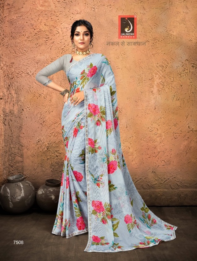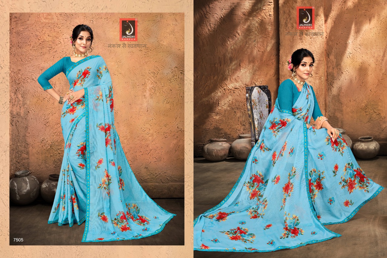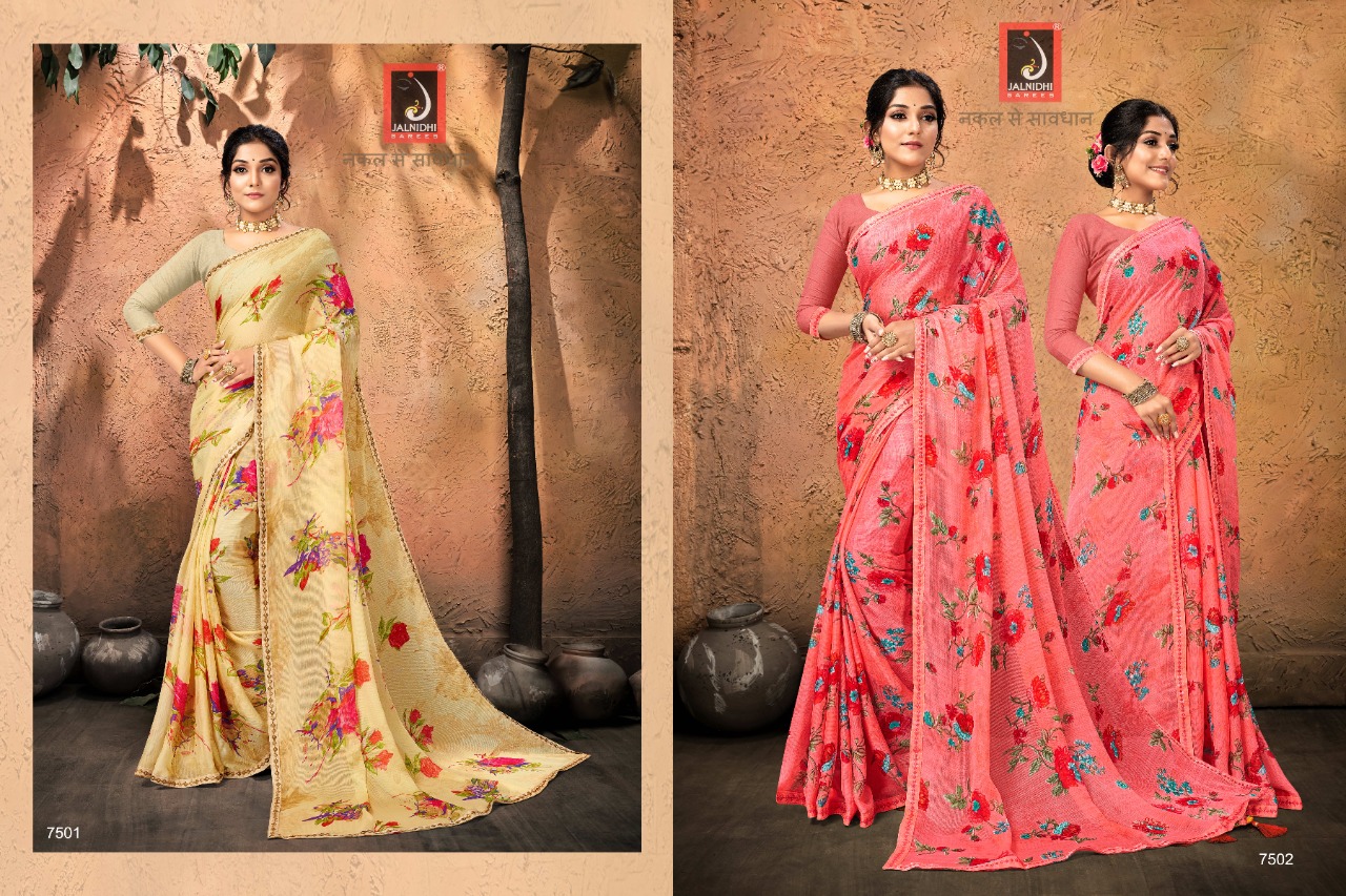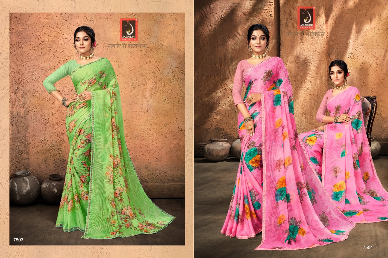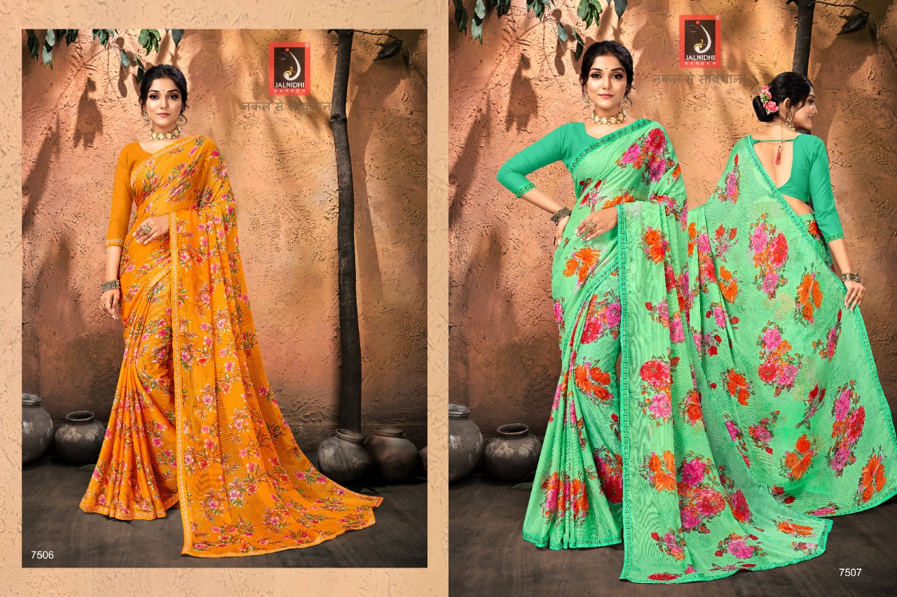 Jalnidhi Presents Flowery 7501 - 7508 Series Beautiful Moss Chiffon With Fancy Colours Casual Wear Saree Collection