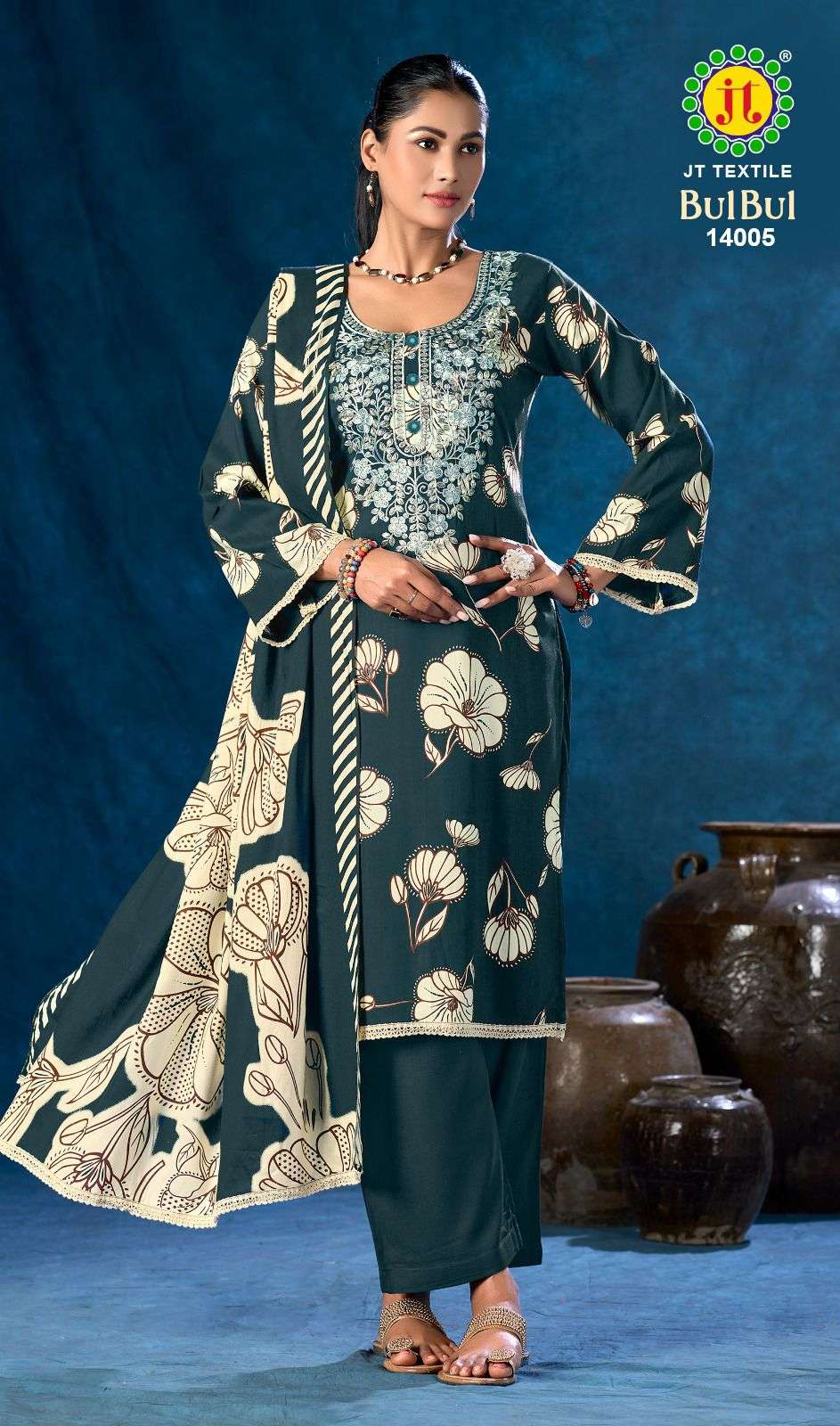 | Catalogue: | JT Textile BULBUL 14 Rayon Fabric Embroidery & Foil Printed Suit |