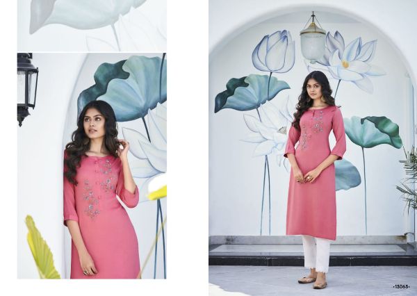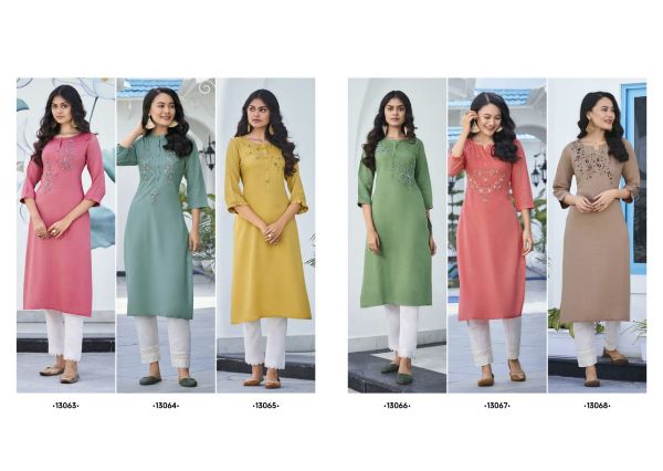 Kalaroop Presents Vision 2 13063-13068 Series Silk Liva Fabrics With Fancy Khatli Work Kurti Collection