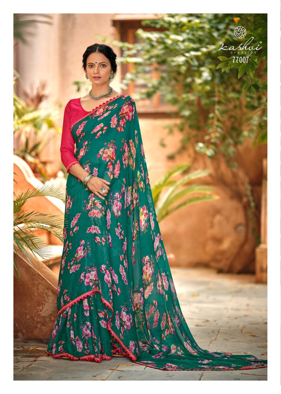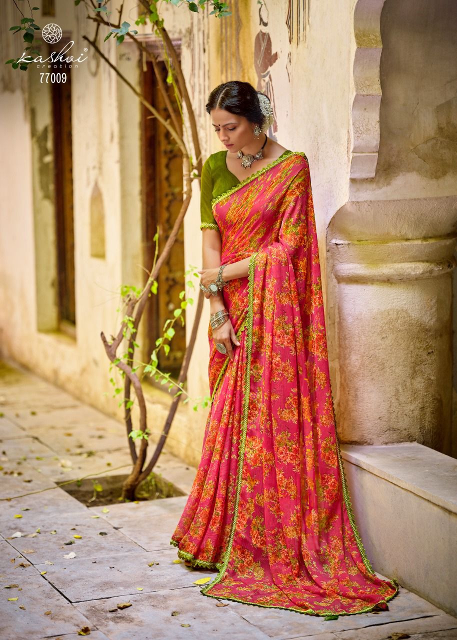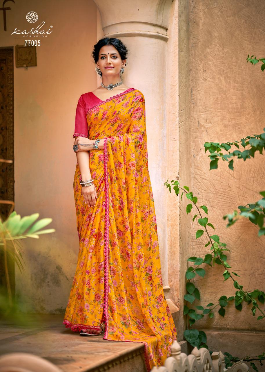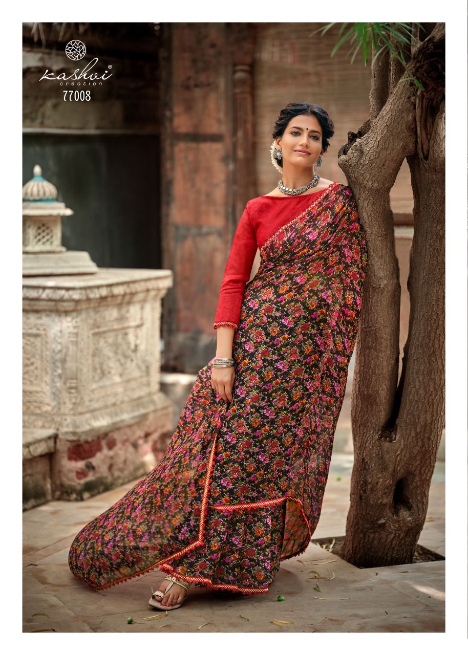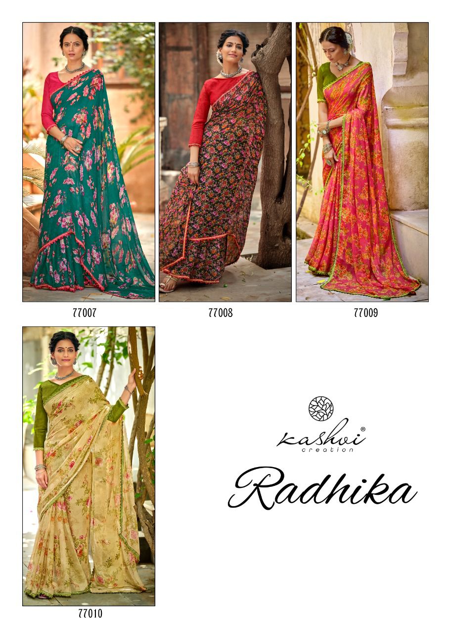 Kashvi Creation Presents Radhika 77001 - 77010 Series Chiffon With Fancy Lace Casual Wear Saree Collection