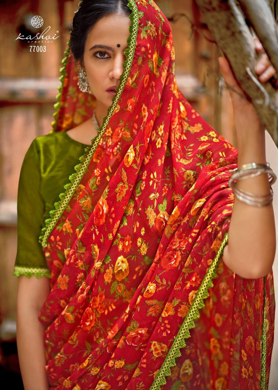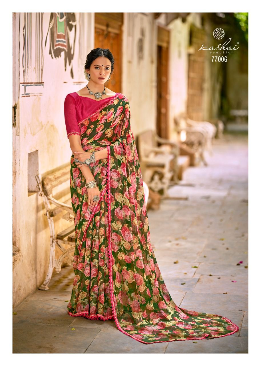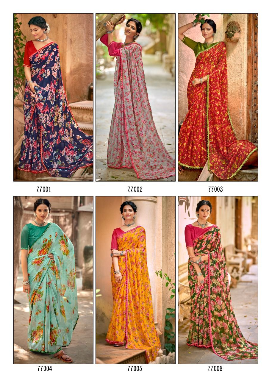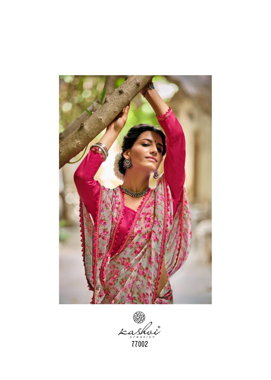 Kashvi Creation Presents Radhika 77001 - 77010 Series Chiffon With Fancy Lace Casual Wear Saree Collection