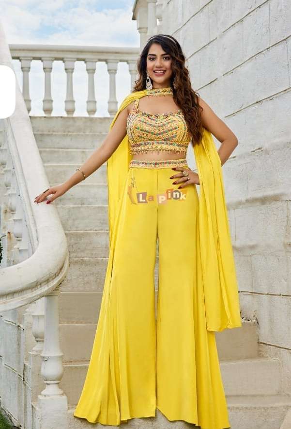 Elevate your festive wardrobe with this designer Indo Western Divider Set, crafted on luxurious viscose fabric. Adorned with exquisite handwork featuring multi moti and jari detailing, this outfit perfectly blends traditional artistry with a modern silhouette. Paired with a stylish neck dupatta, it offers an effortlessly graceful and statement-making look for any occasion.
