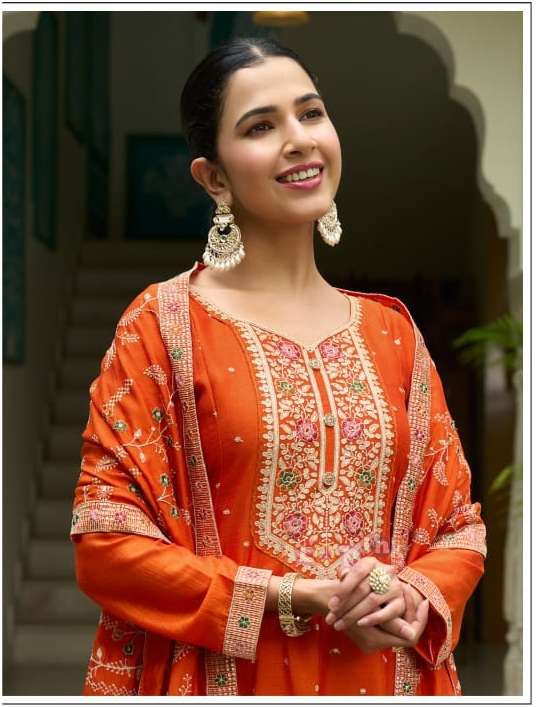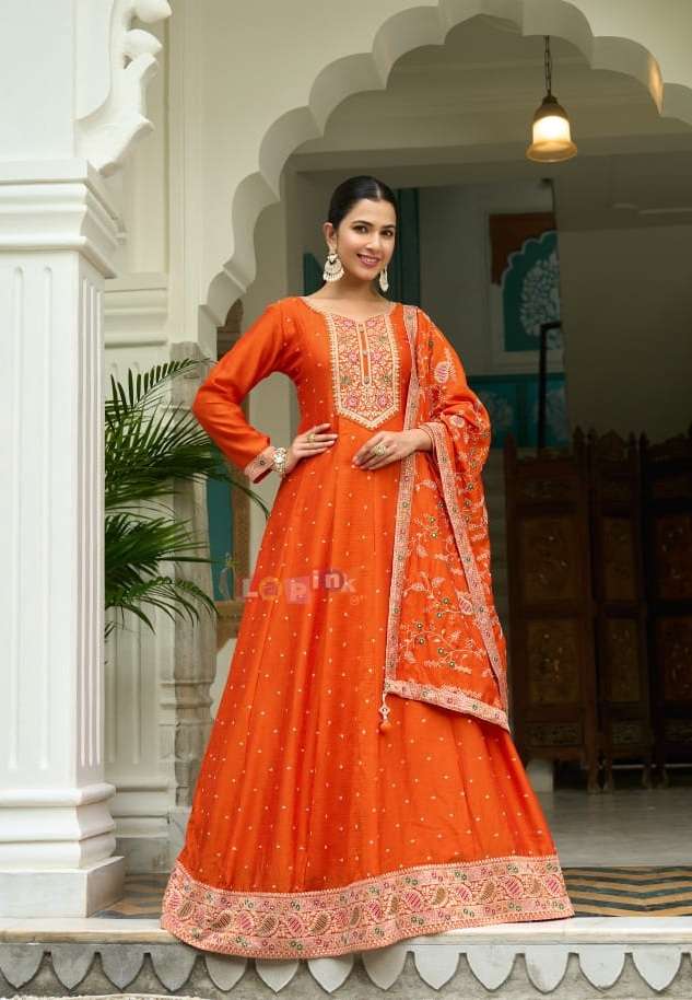 | Catalogue: | lapink JASMINE 1001 Ready to Wear Premium Silk Embroidered Orange Anarkali Suit |