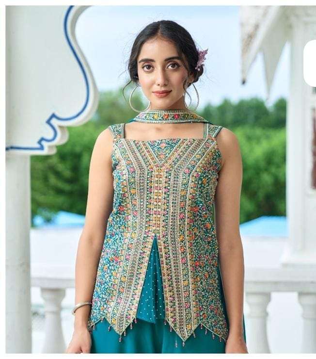 Redefine festive elegance with this designer peplum suit set, crafted from rich viscose fabric. The outfit features intricate multi-thread embroidery enhanced with stone work, adding a subtle sparkle to its graceful design. Paired with matching plazo pants and a neck-style dupatta, this ensemble perfectly balances tradition and modern sophistication — ideal for festive occasions, weddings, and celebrations.