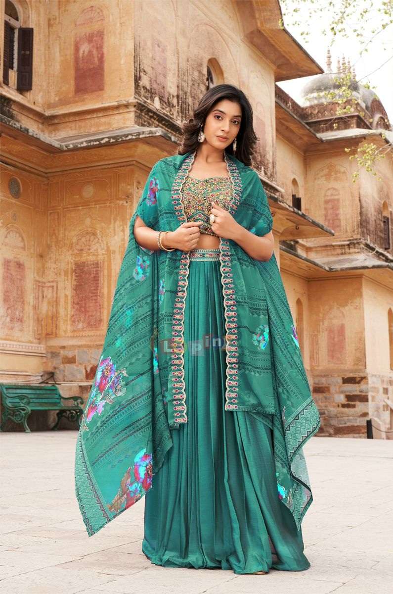Elevate your festive style with this designer Indo Western three-piece set, crafted from premium viscose fabric. Adorned with multi-thread embroidery and delicate stone work, the outfit exudes timeless charm and modern sophistication. The printed cape overlay adds a contemporary flair, making it perfect for celebrations, parties, and elegant evening occasions.