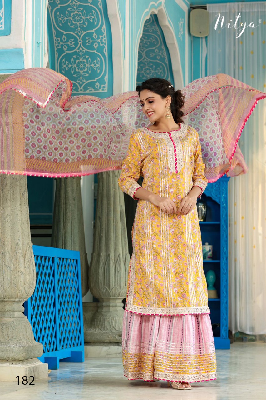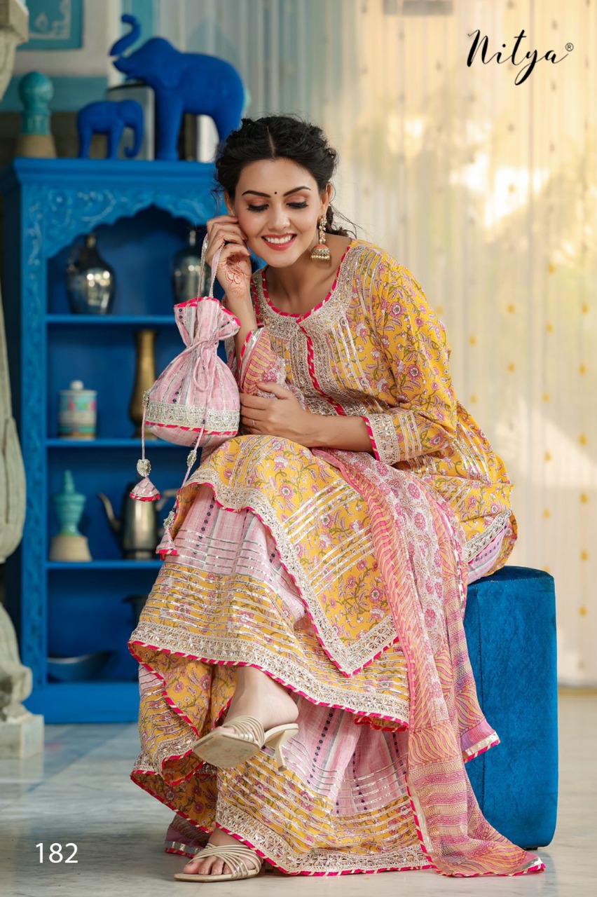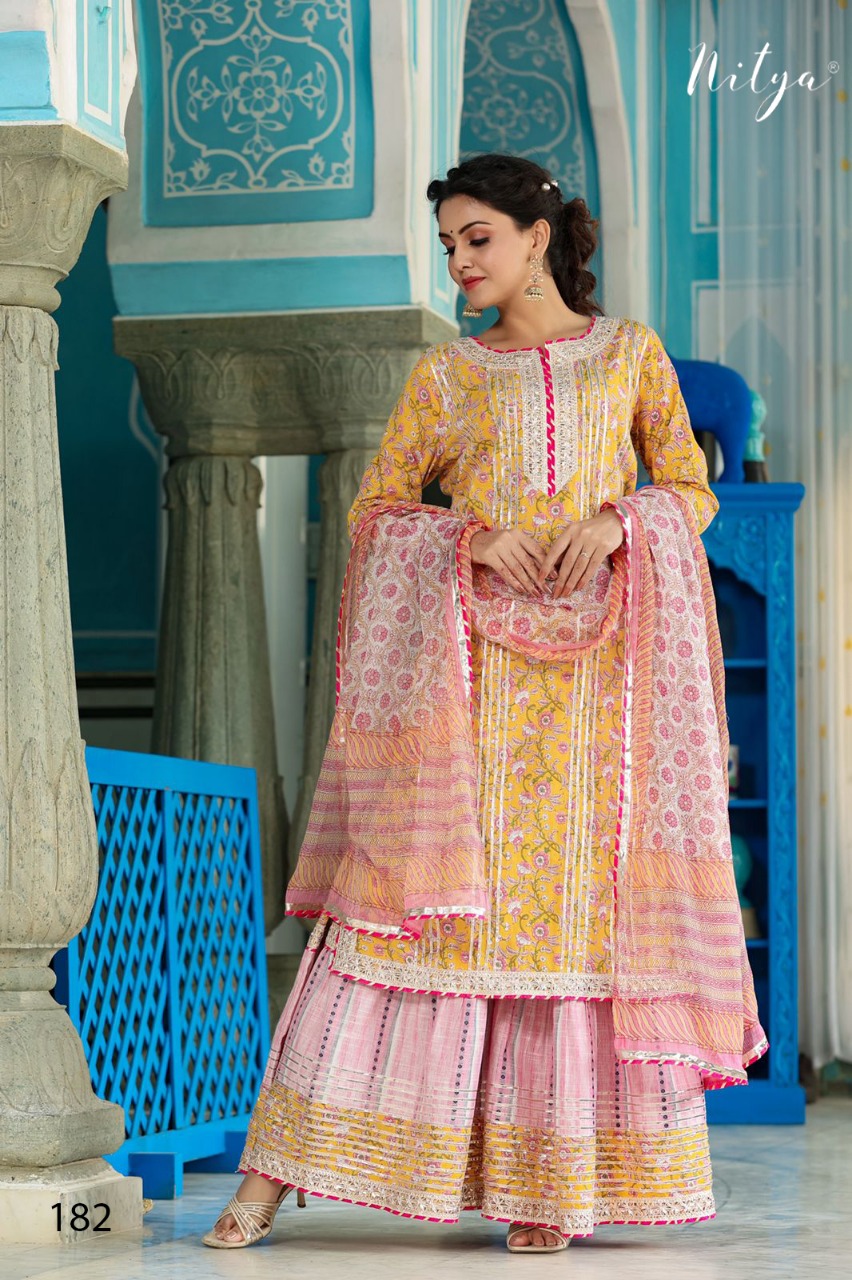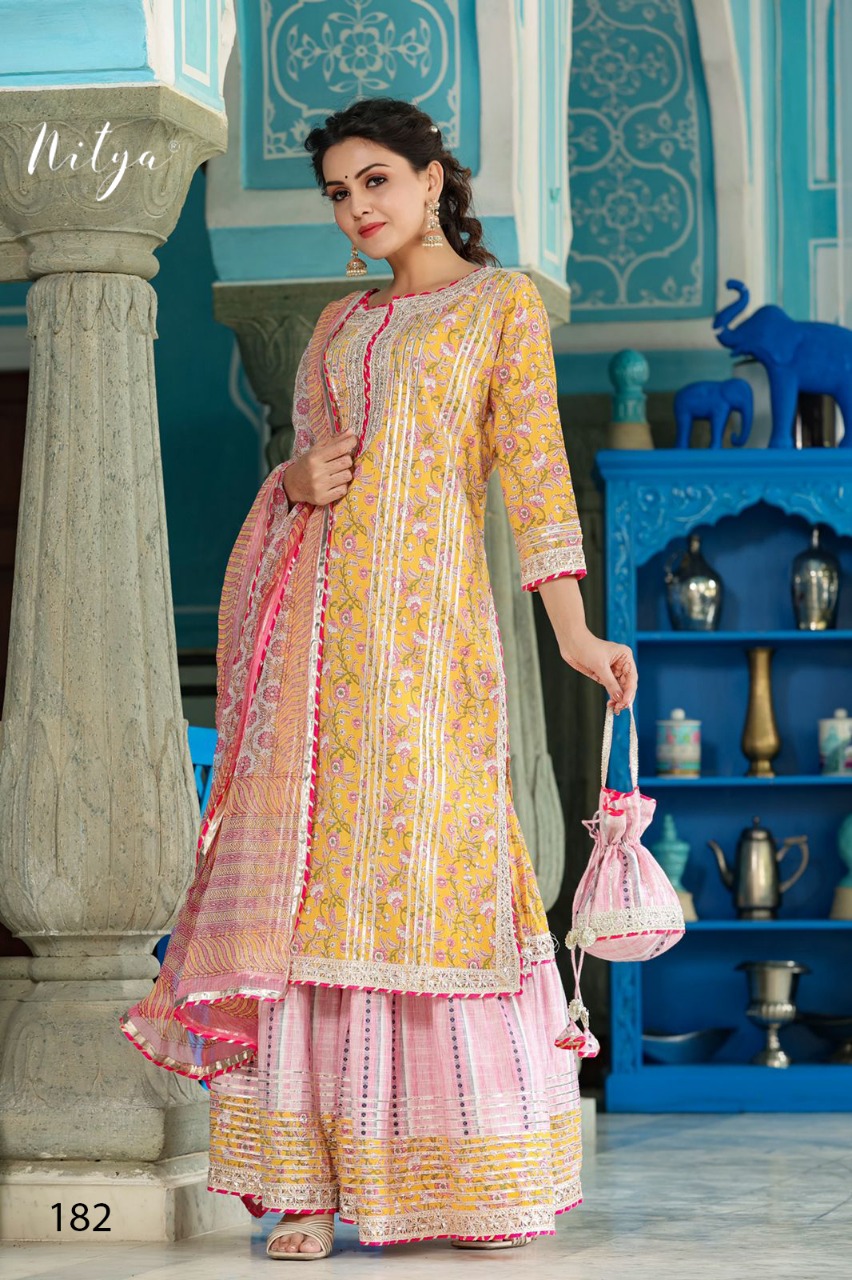 Lt Nitya Presents 182 Pure Cotton With Fancy Designer Work With Attractive Look Fancy Party Wear Top With Sharara And Dupatta Collection