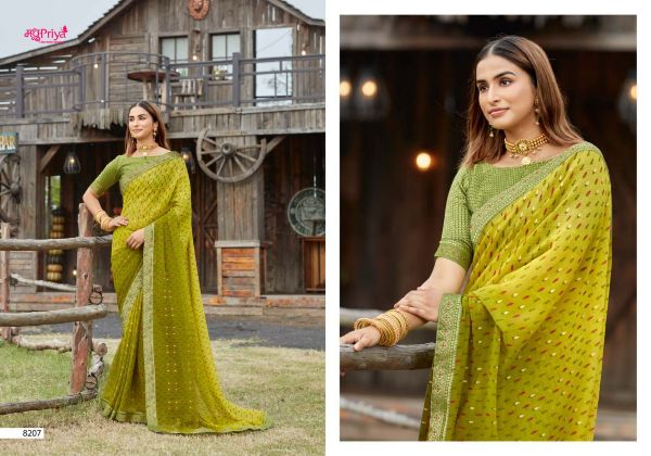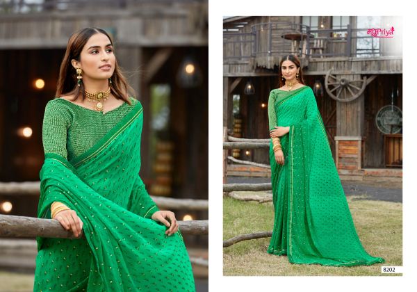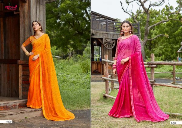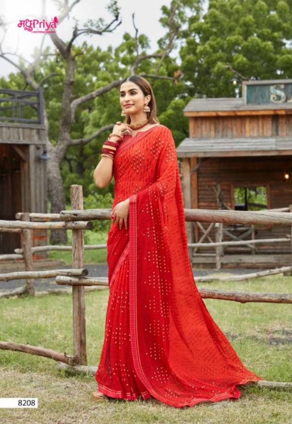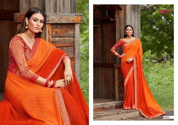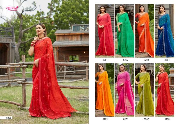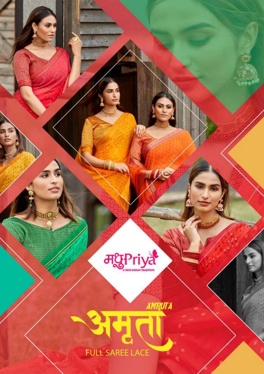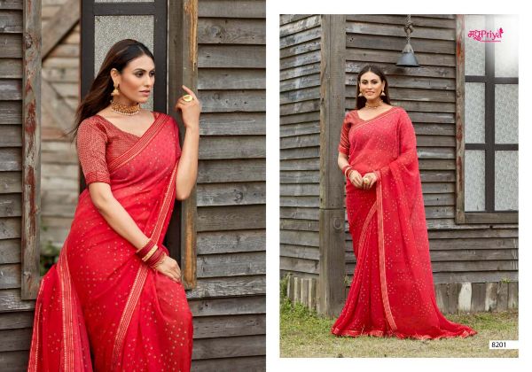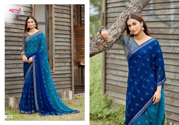 Madhupriya Presents Amruta 8201-8208 Series Chiffon With Print And Jacquard Broder Fancy Saree Collection
