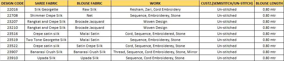 Type: | Designer Sarees, Multi Fabrics, PartyWear, Wedding Wear Sarees |