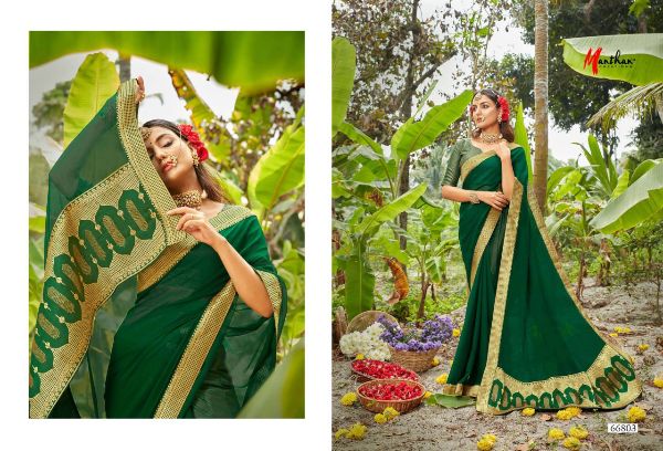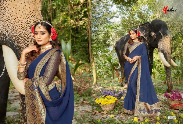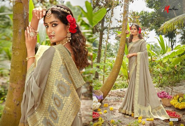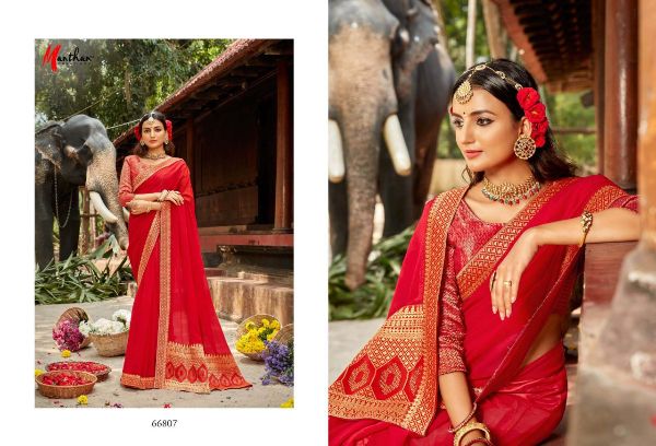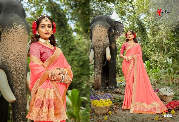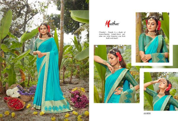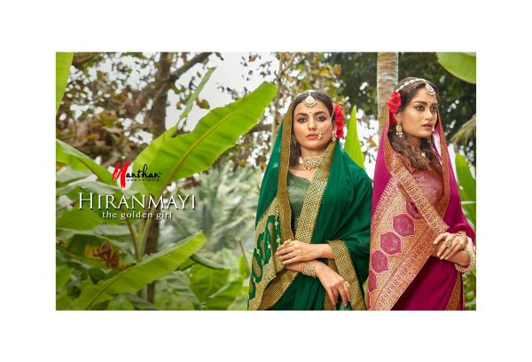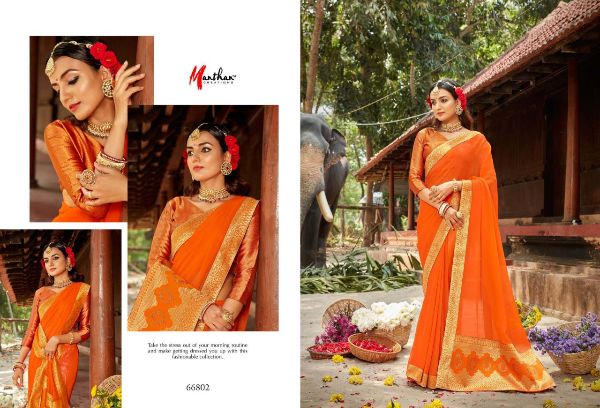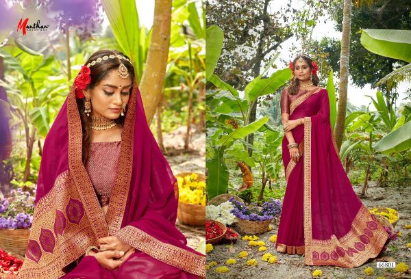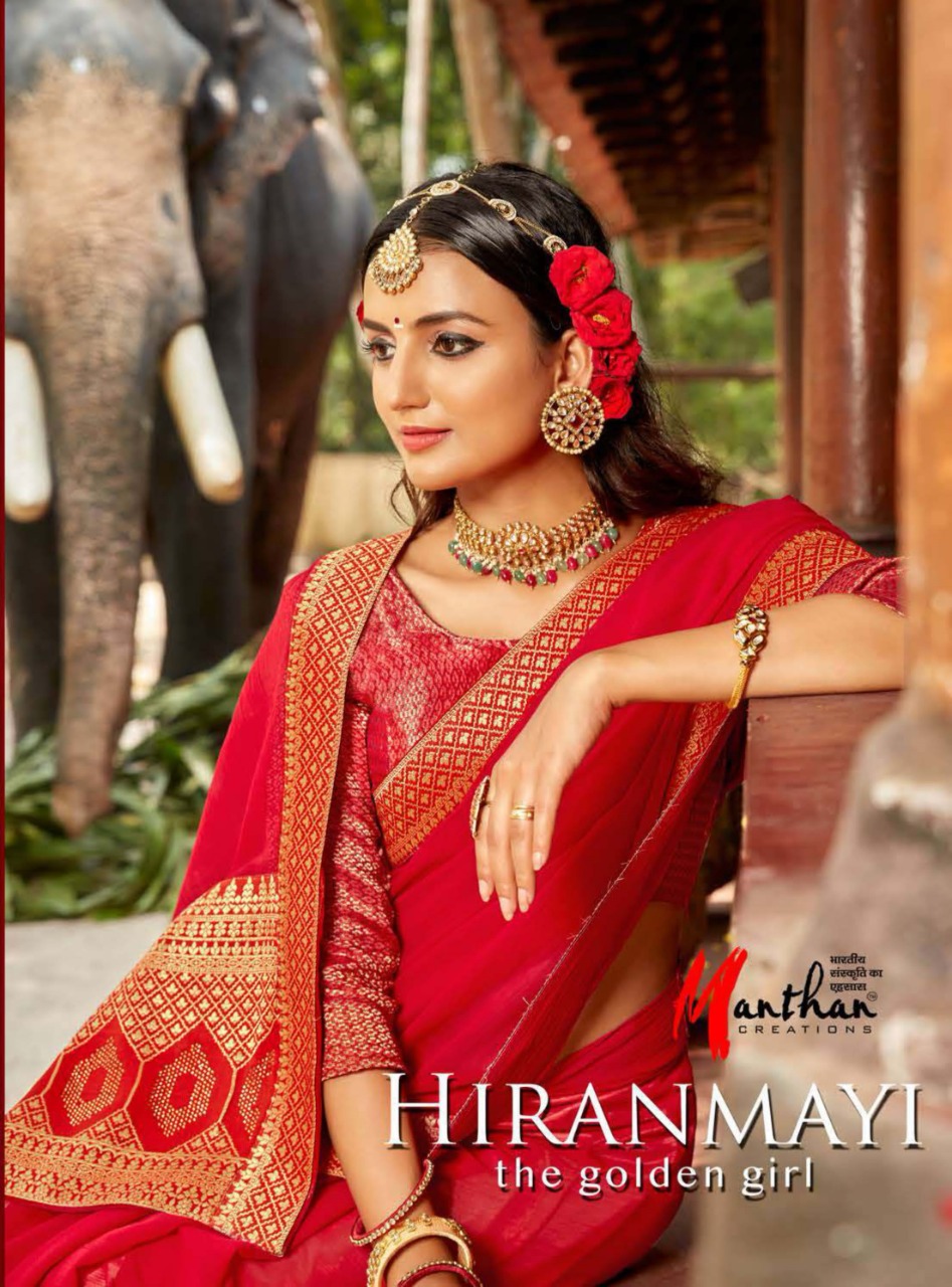 Manthan Presents Hiranmayi 66801 - 66810 Series Chiffon With Heavy Jacquard Broder And Rapier Pallu Fancy Saree Collection