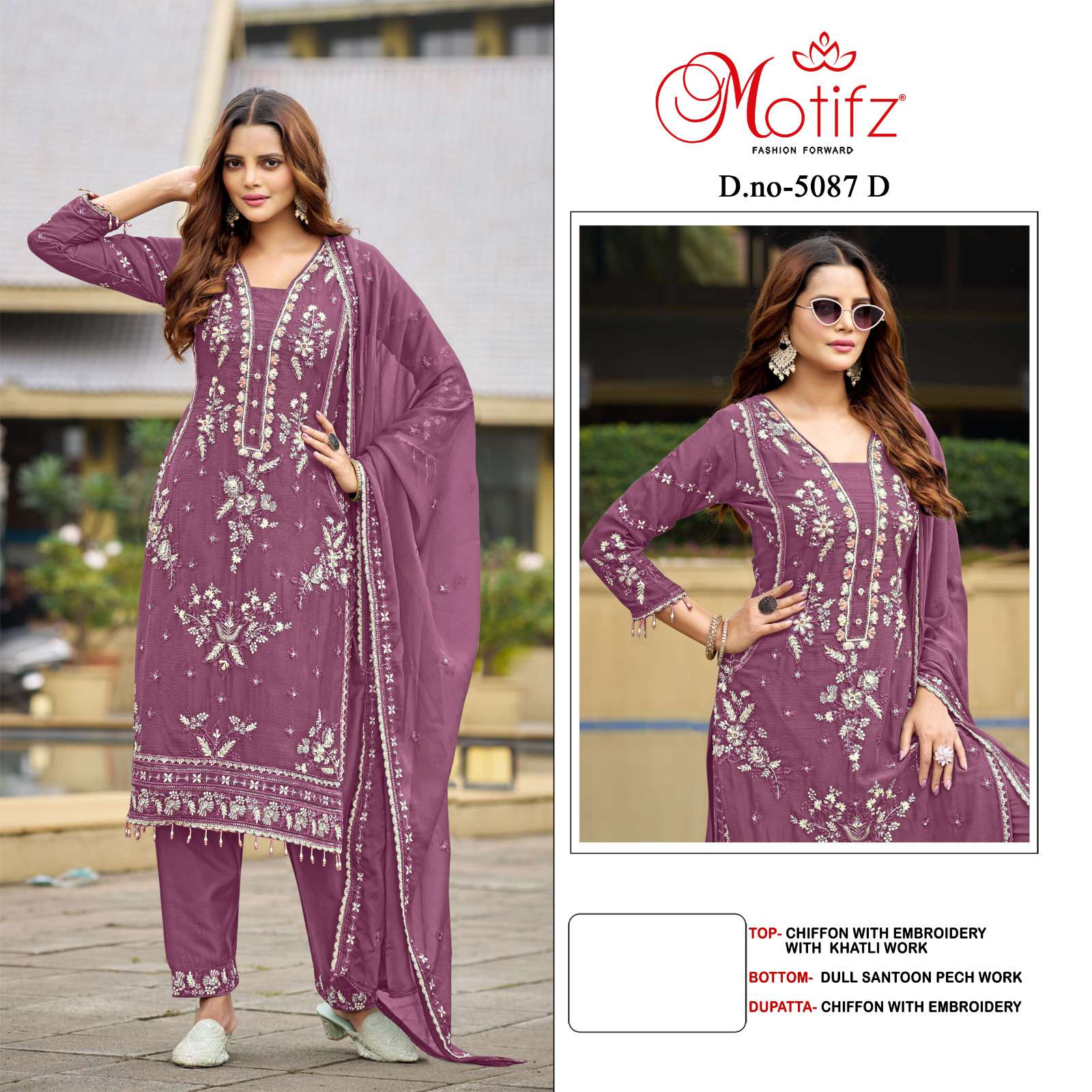| Catalogue: | Motifz 5087 Chiffon Pakistani Suit with Embroidery & Khatli Work |