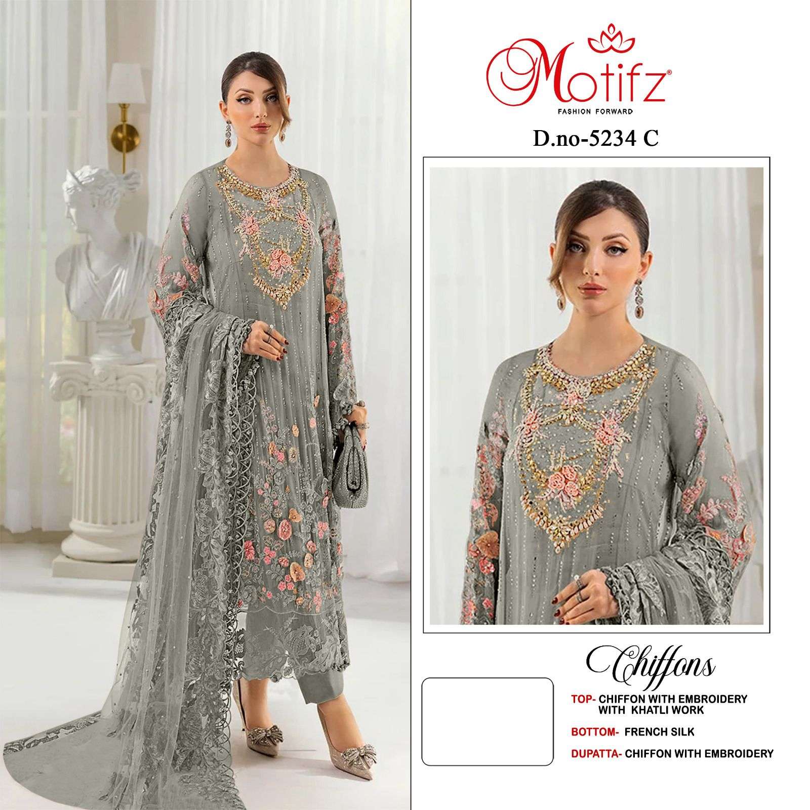 | Catalogue: | Motifz 5234 Chiffon Pakistani Suit with Embroidery & Khatli Work |
