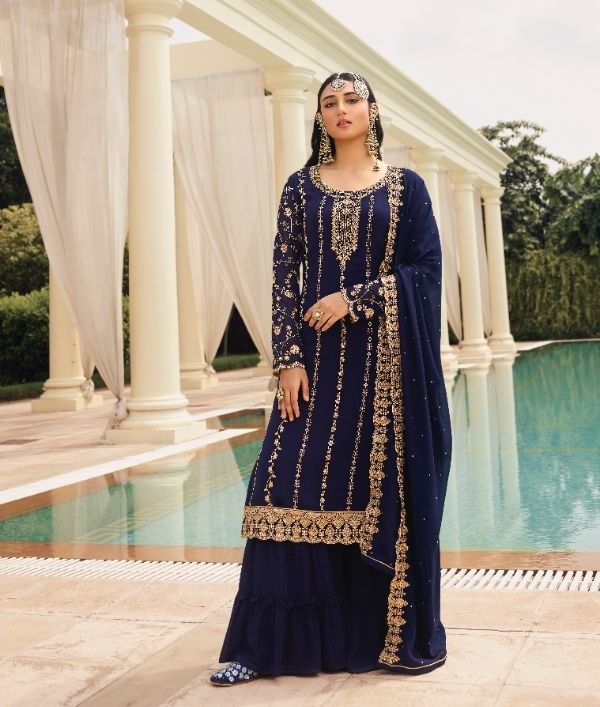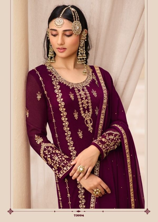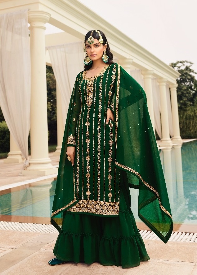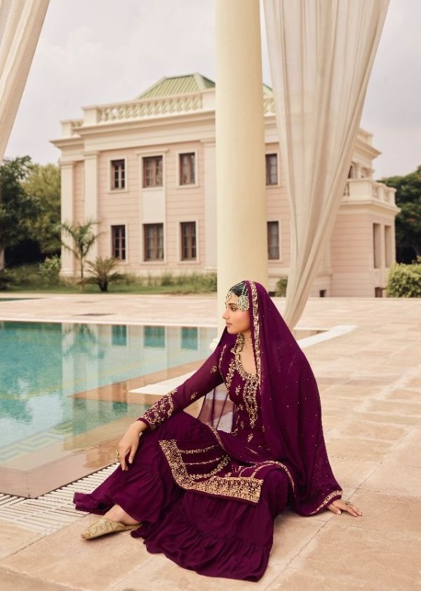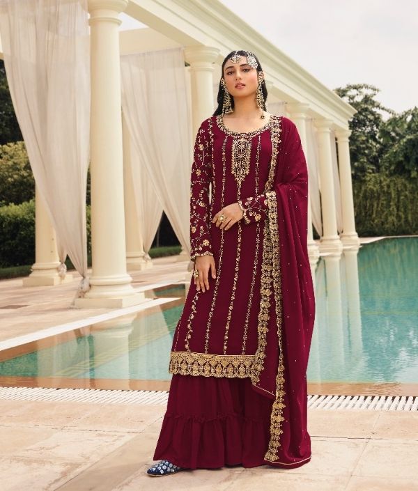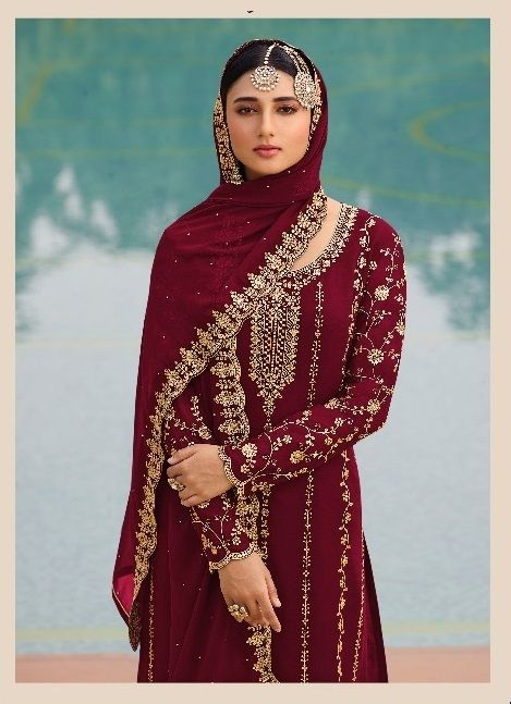Latest Designer Palazzo Suit Collection. Exclusive Suit with Heavy Embroidery Work gives a Fashionable Look, High sensed style and luxury makes you ready for envious glazes and very rich & Royal in the Party, Function, Event etc.