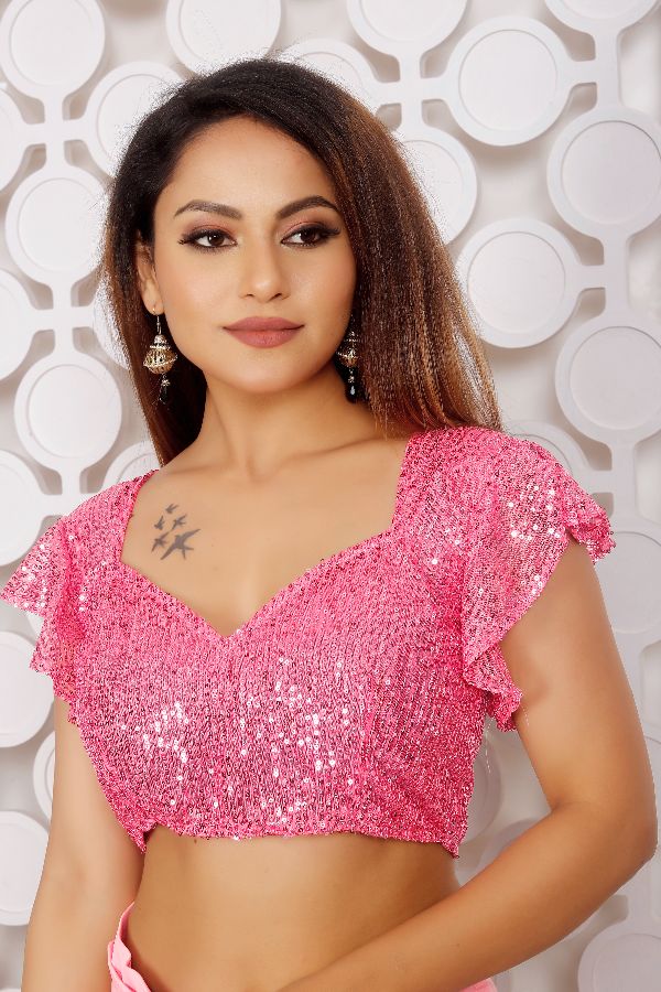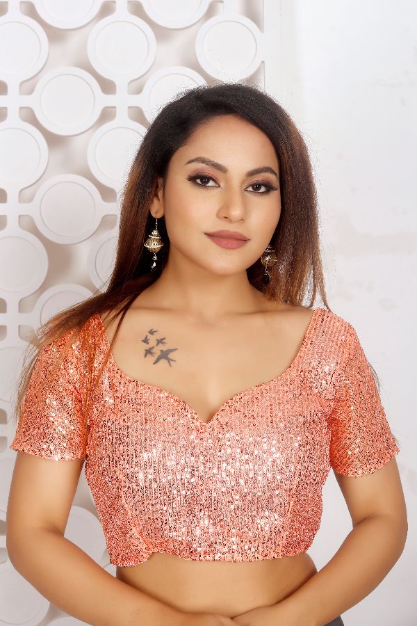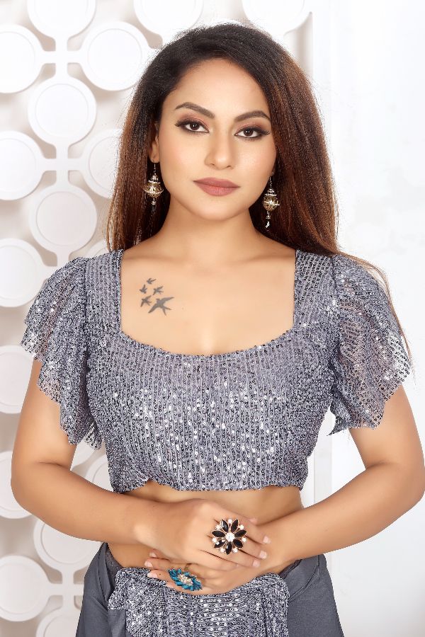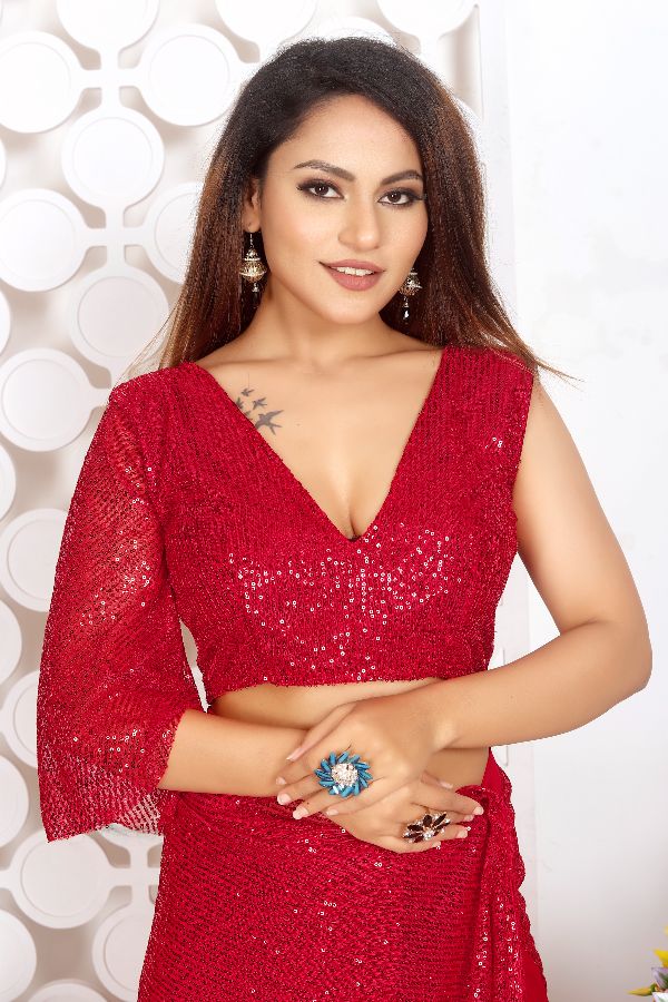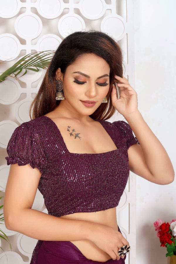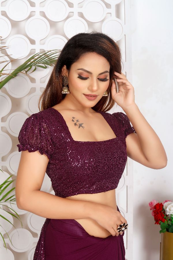 Fabric : Saree � Imported silk lycra || Blouses � Heavy sequence work on velvet (unstitched) || Saree pattern � full ready to wear.