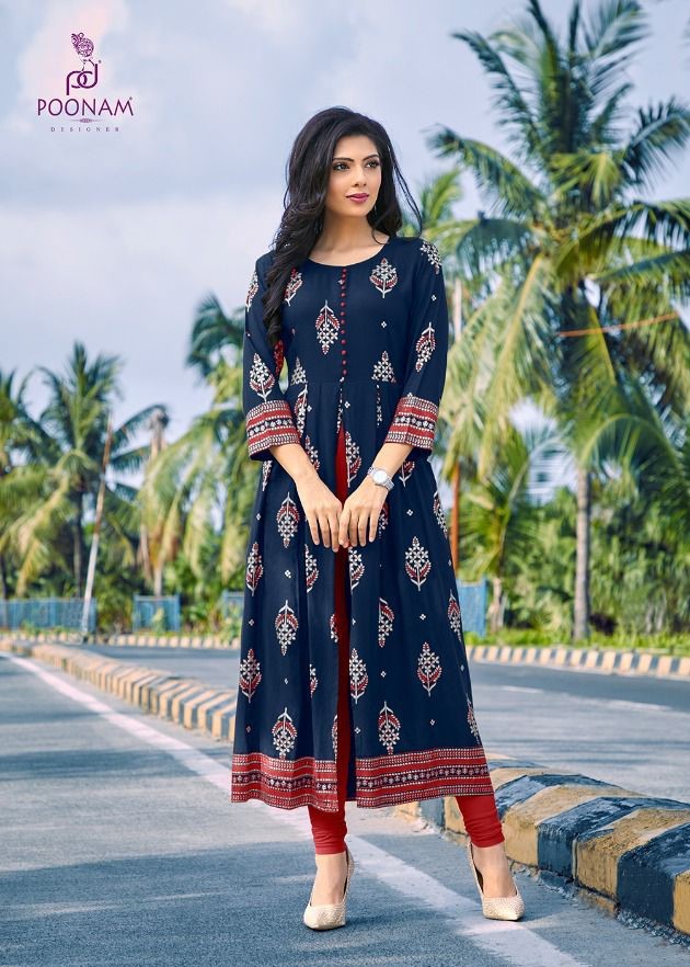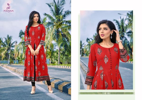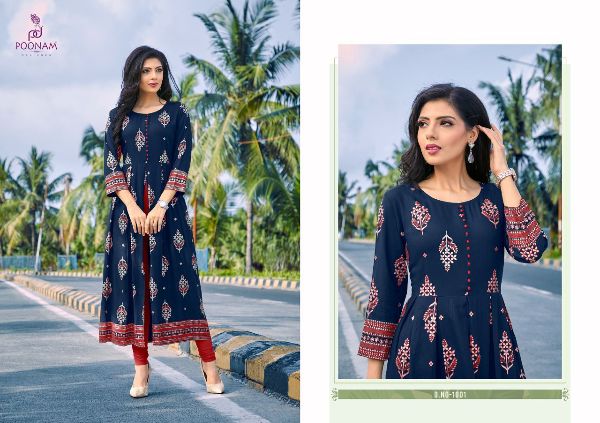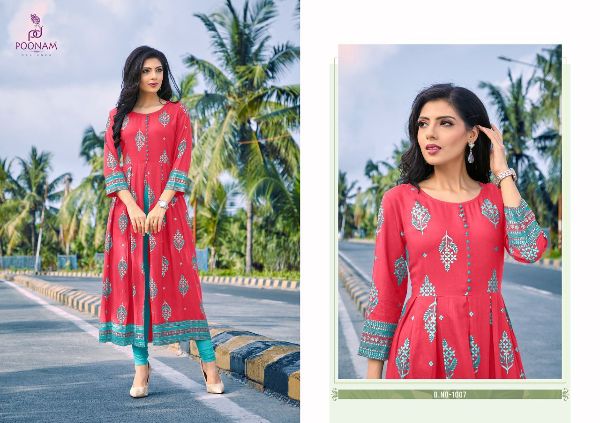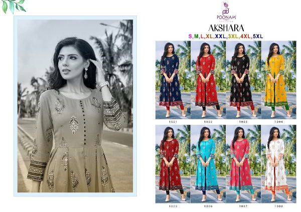 Poonam Designer Presents Akshara 1001-1008 Series Pure Rayon With Foil Print Fancy Kurti Collection