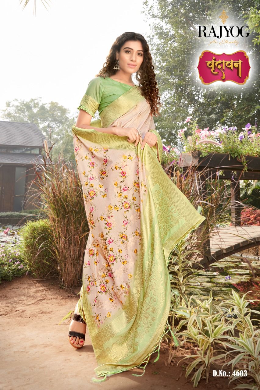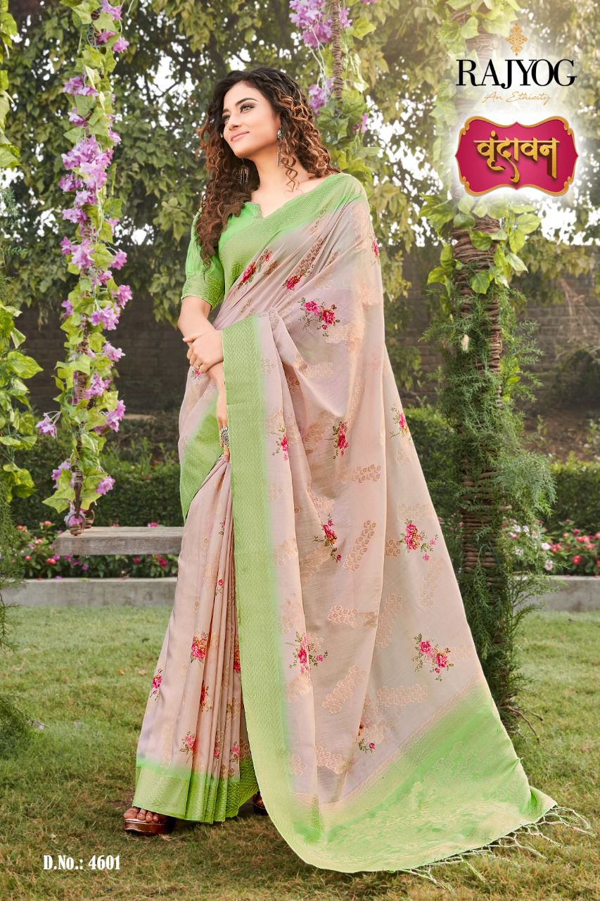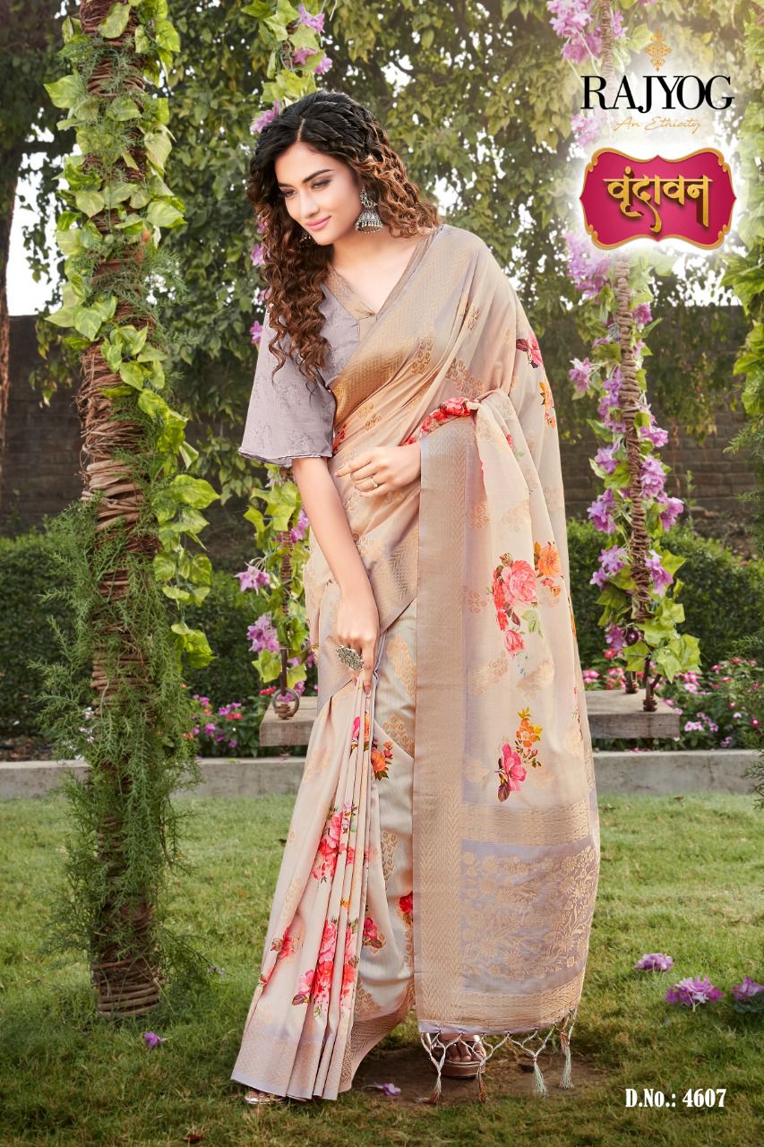 Rajyog Presents Vrindavan Silk 4601 - 4608 Series Soft Butti Banarasi Silk With Digital Print Fancy Event Wear Saree Collection