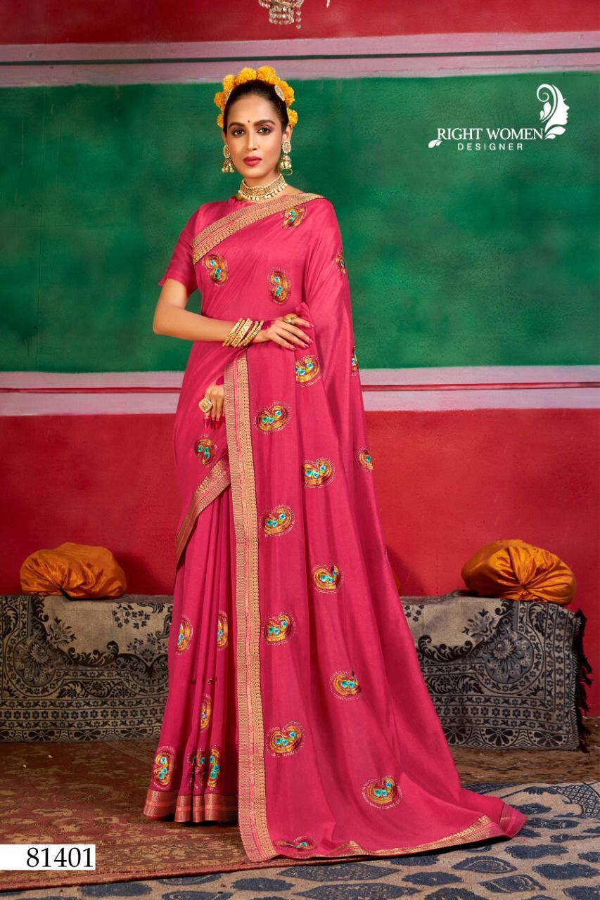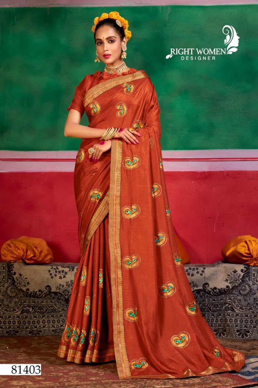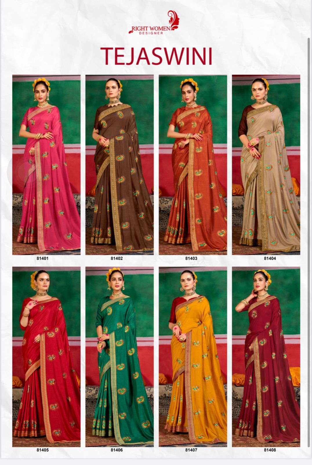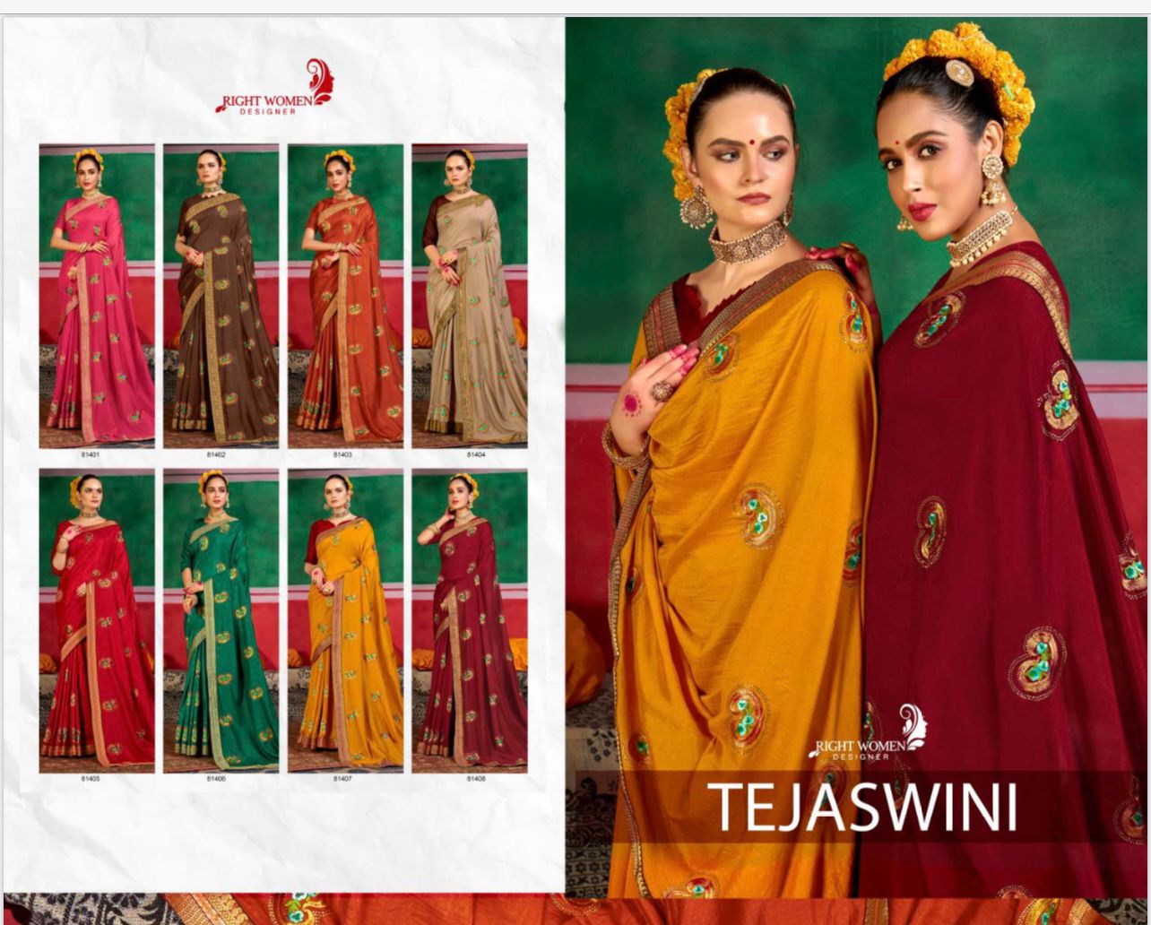Right Women Designer Presents Tejaswini 81401 - 81408 Series Dola Silk With Zari Multy Embroidery Work Fancy Event Wear Saree Collection