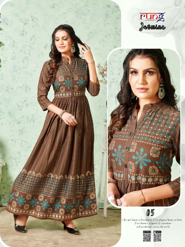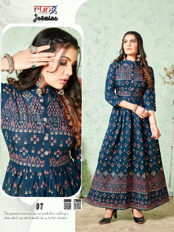 Rung Presents Jasmine 01-08 Series Heavy Rayon With Gold Print Fancy Kurti Collection