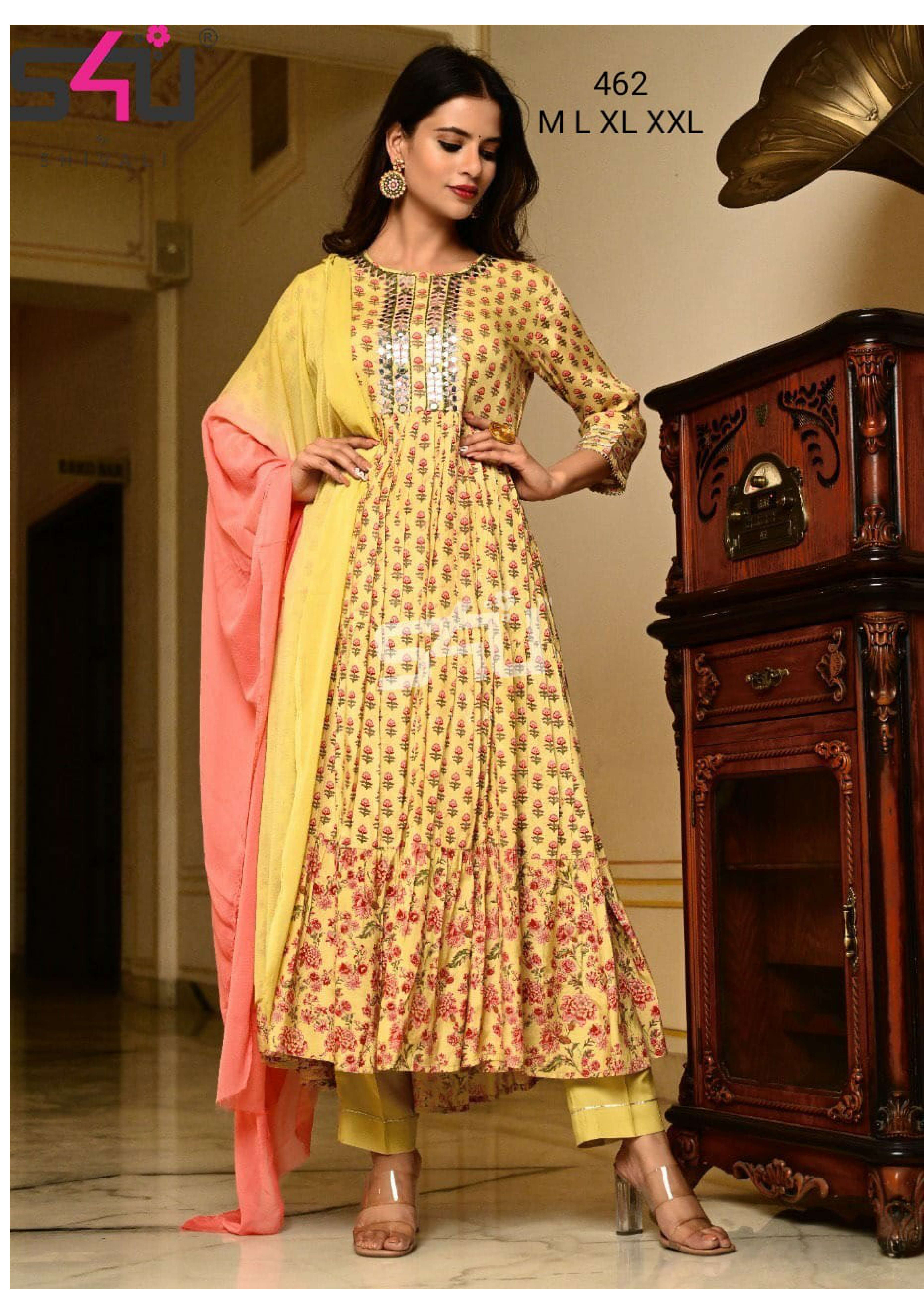 S4U PRESENTS 462 DESIGN YELLOW DESIGNER KURTIS WITH PANT AND DUPATTA SET WHOLESALE RATES N371