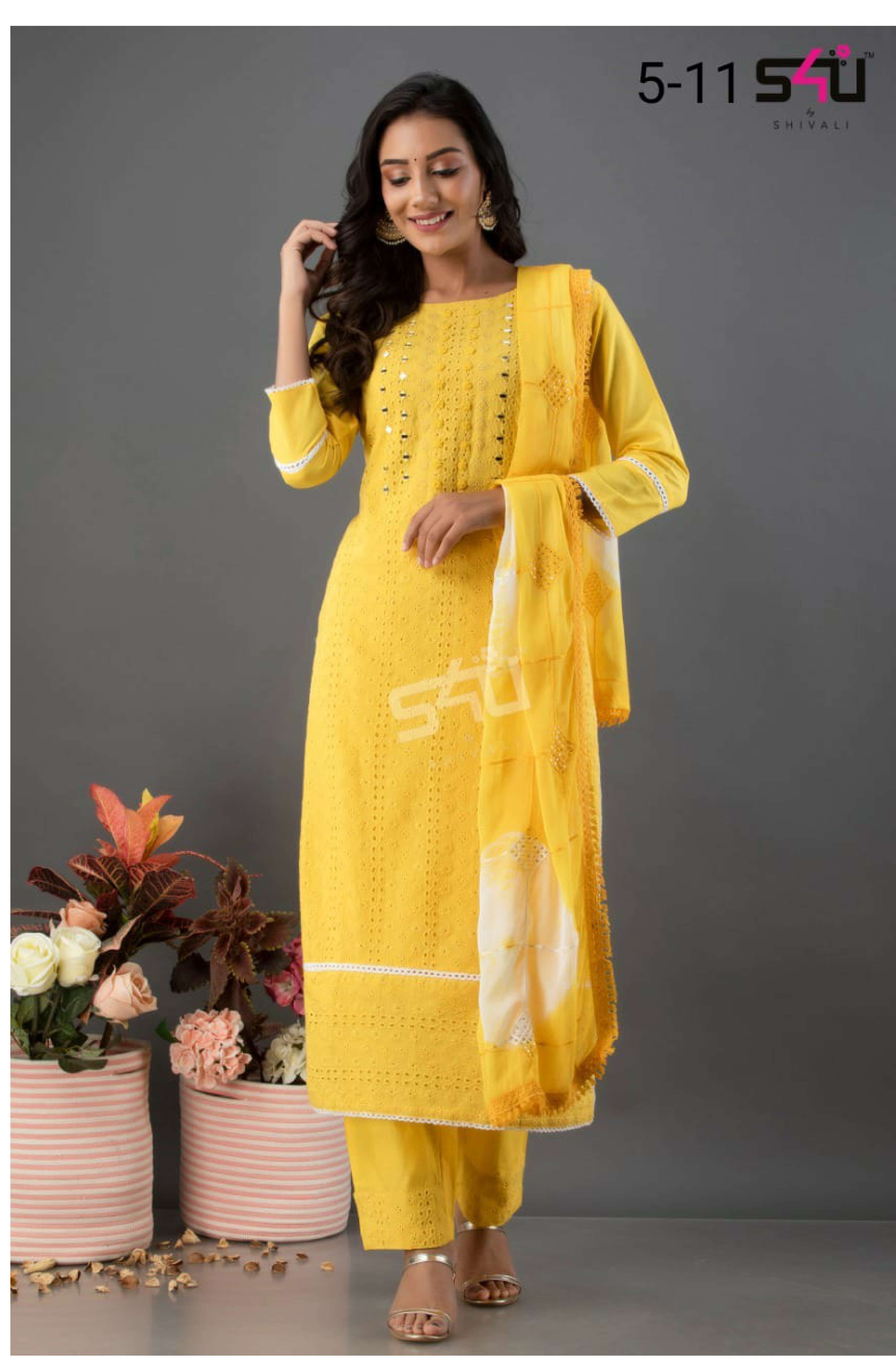 S4U PRESENTS SHIVALI 5-11 FANCY YELLOW KURTIS WITH PANT AND DUPATTA SET AT WHOLESALE PRICE N371