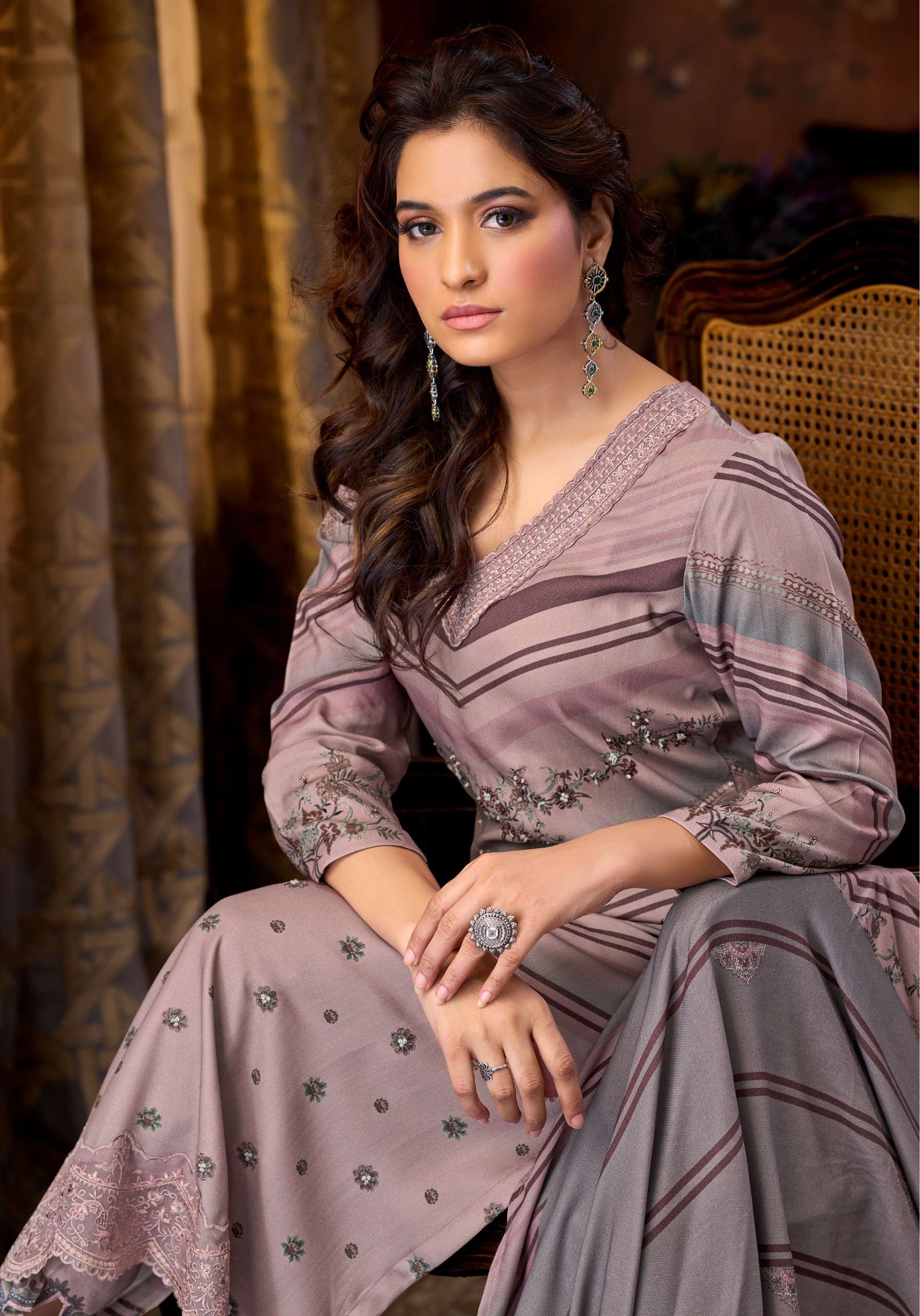 PURE PASHMINA DIGITAL PRINT WITH HAND WORK AND FANCY EMB. DAMAN AND NECK PLACKET PURE PASHMINA PRINTED EMB. PLAZZO