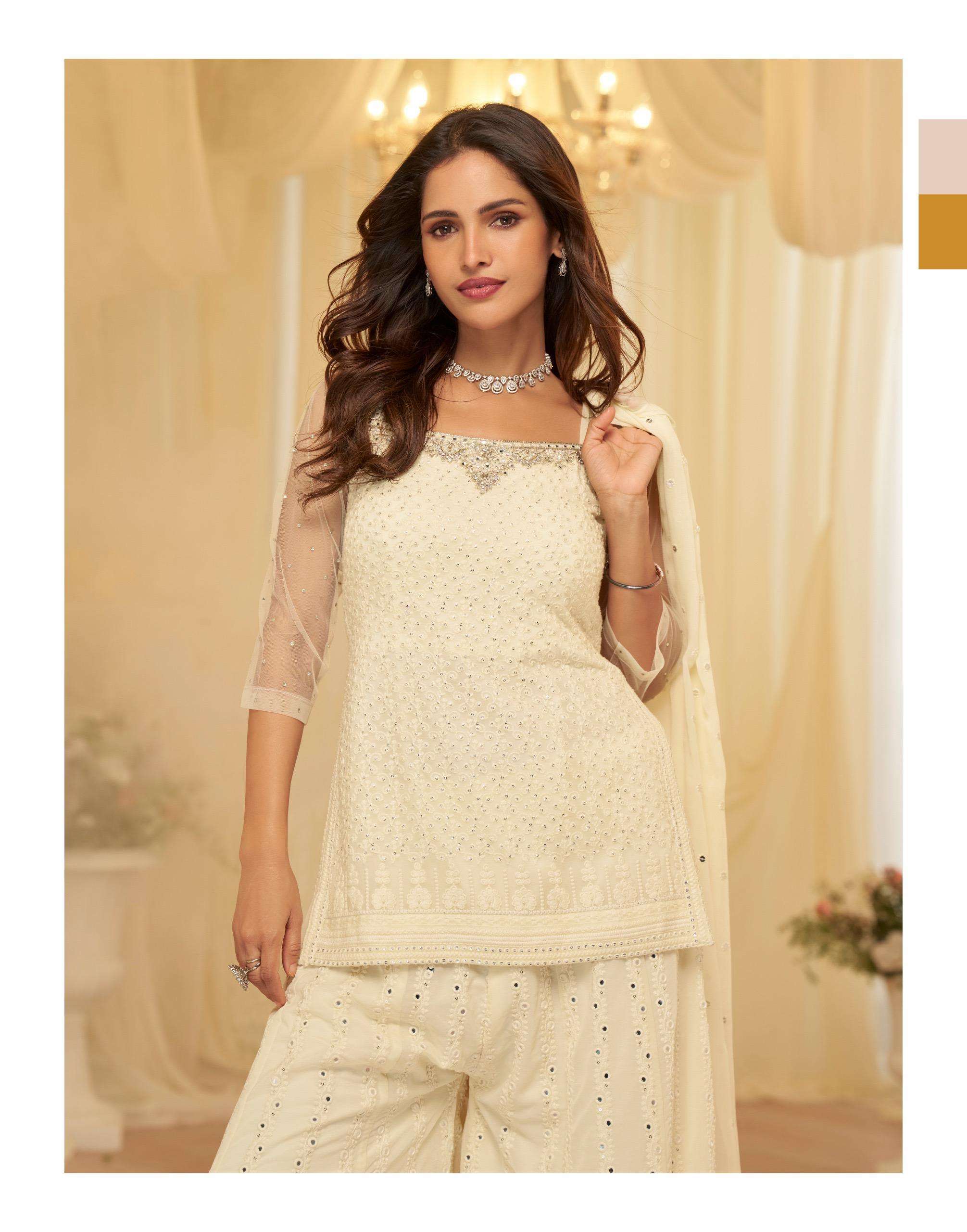FABRIC - PREMIUM REAL GEROGETTE ( LATEST TRENDY CHIKANKARI EMBROIDERED TOP WITH EMBROIDERED SHARARA AND DUPATTA )