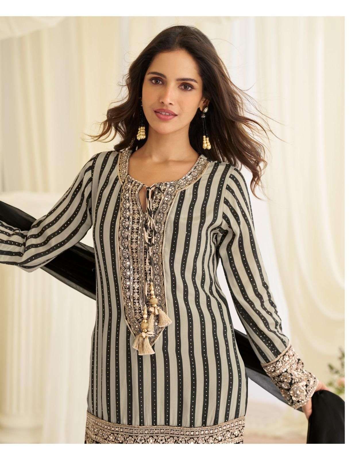 FABRIC - PREMIUM NATURAL CREP SILK / PREMIUM SIMAR SILK / PREMIUM REAL GEROGETTE ( LATEST TRENDY PREMIUM FABRIC BEADS EMBROIDERED TOP WITH FARSI PlAZZO AND BEADS LACE DUPATTA )