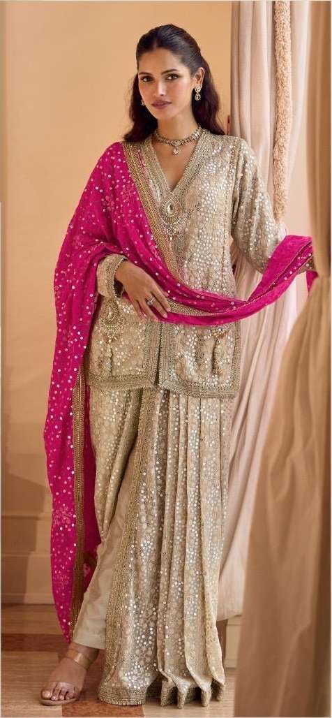 FABRIC - REAL PREMIUM GEROGETTE ( HEAVY EMBROIDERED HAND WORK TOP WITH DHOTI PANT AND HEAVY EMBROIDERED DUPATTA )