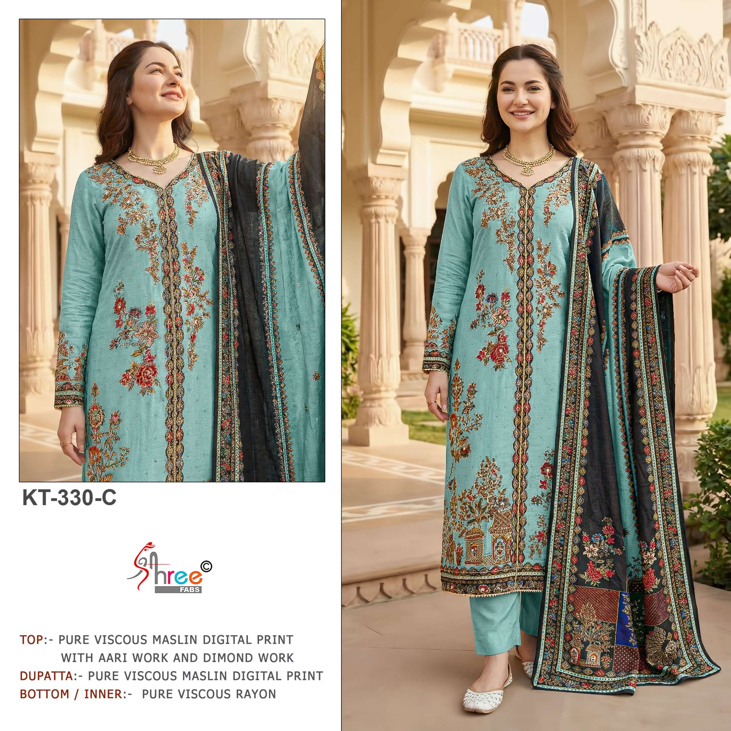 | Catalogue: | Shree Fab KT 330 Pure Viscous Maslin Digital Print and Aari Work Suit collection |