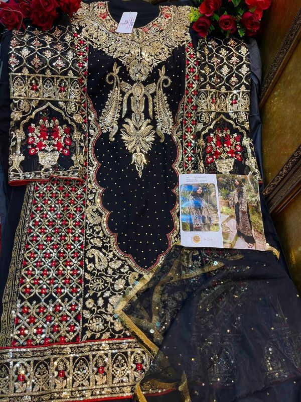 Latest Designer pakistani suits Collection. Exclusive with Foil & Thread Embroidery Work gives a Fashionable Look, High sensed style and luxury makes you ready for envious glazes and very rich & Royal in the Party, Function, Event etc.
