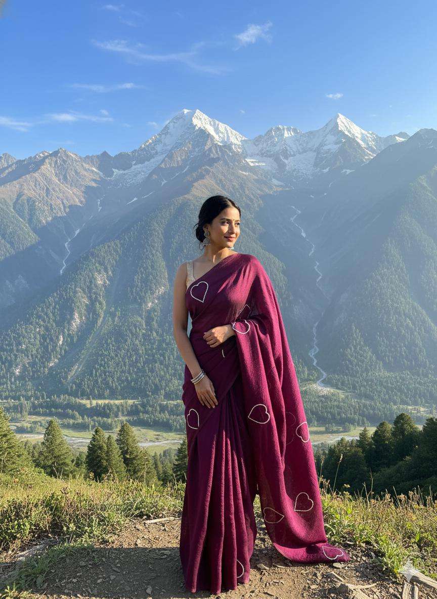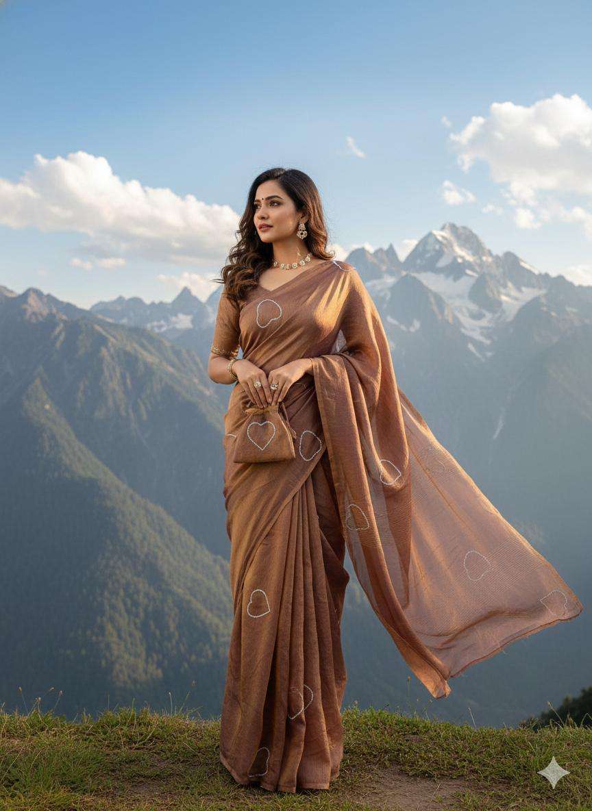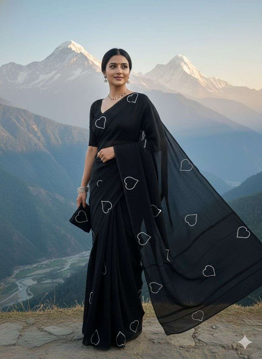 Experience the perfect blend of comfort and glamour. This saree is crafted from high-quality Fendy Chiffon, known for its beautiful texture and lightweight feel. The body is adorned with meticulously placed heart-shaped Jarkhan stone work, providing a sophisticated sparkle that catches the light beautifully.