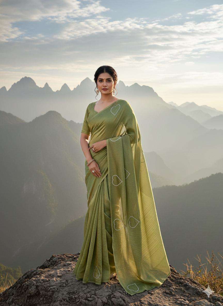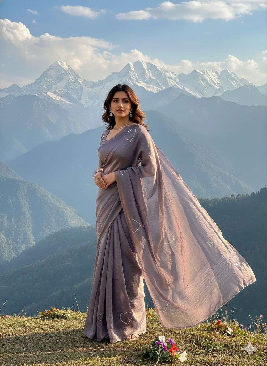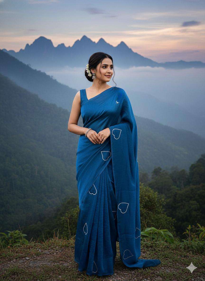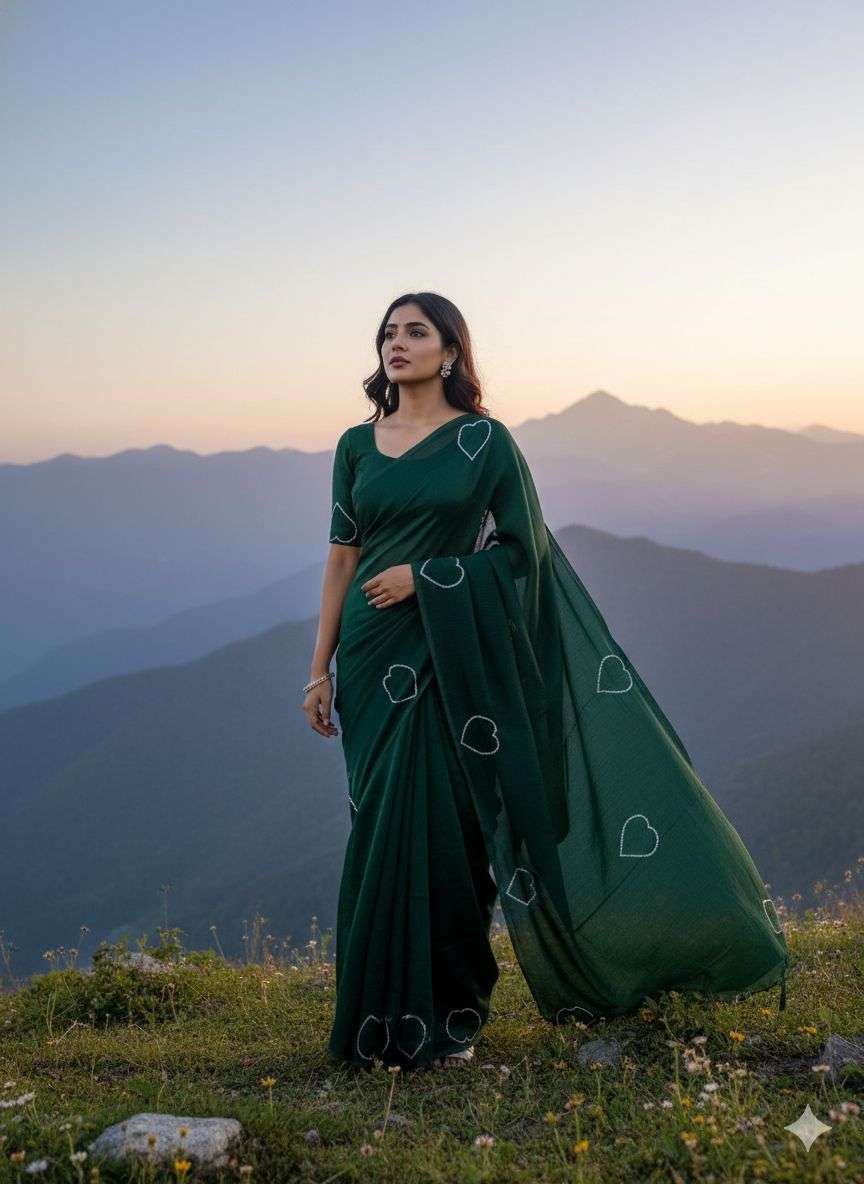Experience the perfect blend of comfort and glamour. This saree is crafted from high-quality Fendy Chiffon, known for its beautiful texture and lightweight feel. The body is adorned with meticulously placed heart-shaped Jarkhan stone work, providing a sophisticated sparkle that catches the light beautifully.